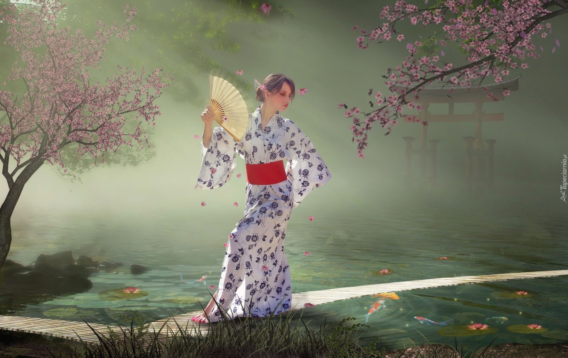 Edytor tapety: Japonka, Wachlarz, Kwitnące, Wiśnie