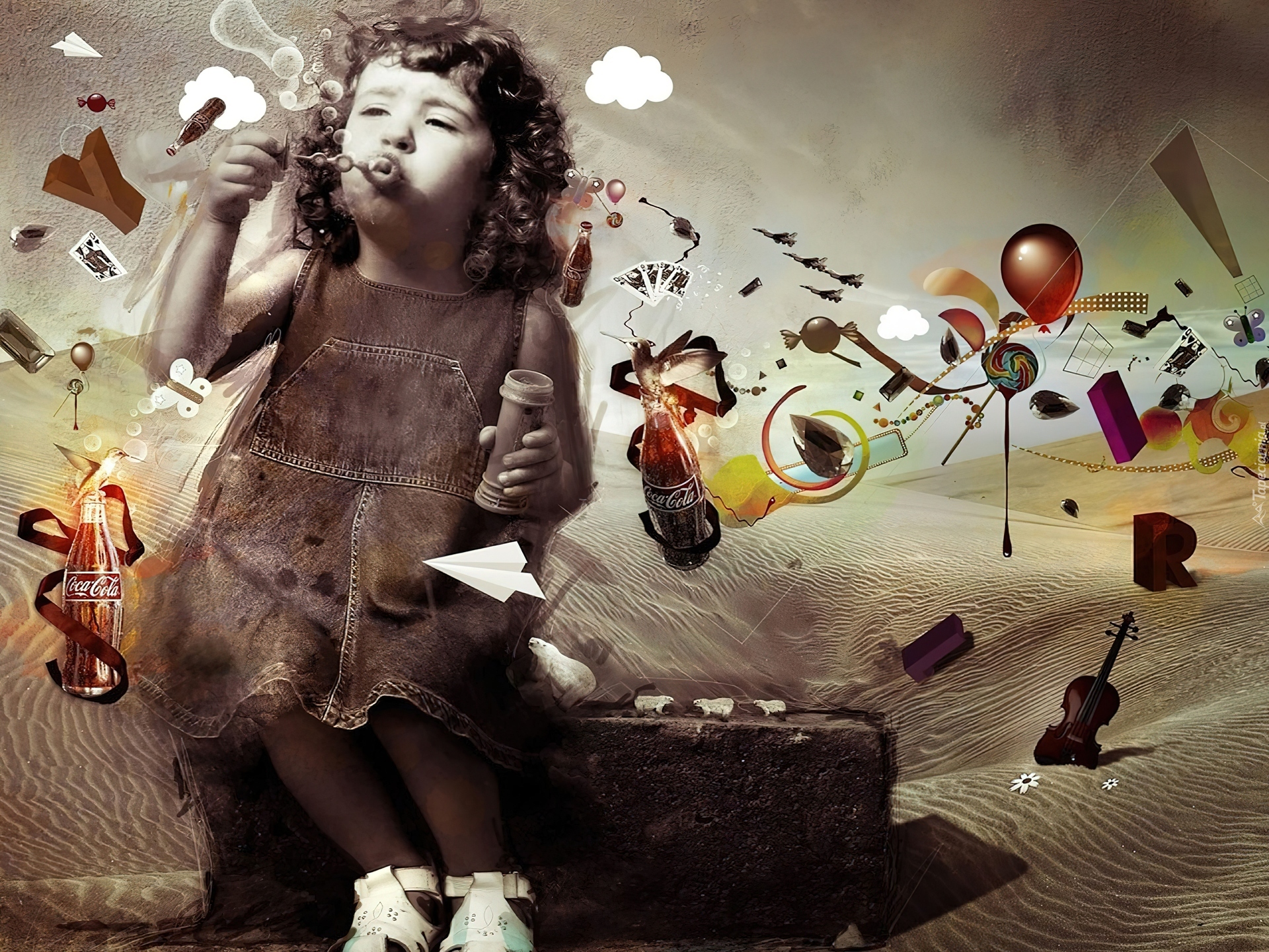 Edytor tapety: Dziewczynka, Bańki, Mydlane, Walizka, Cola