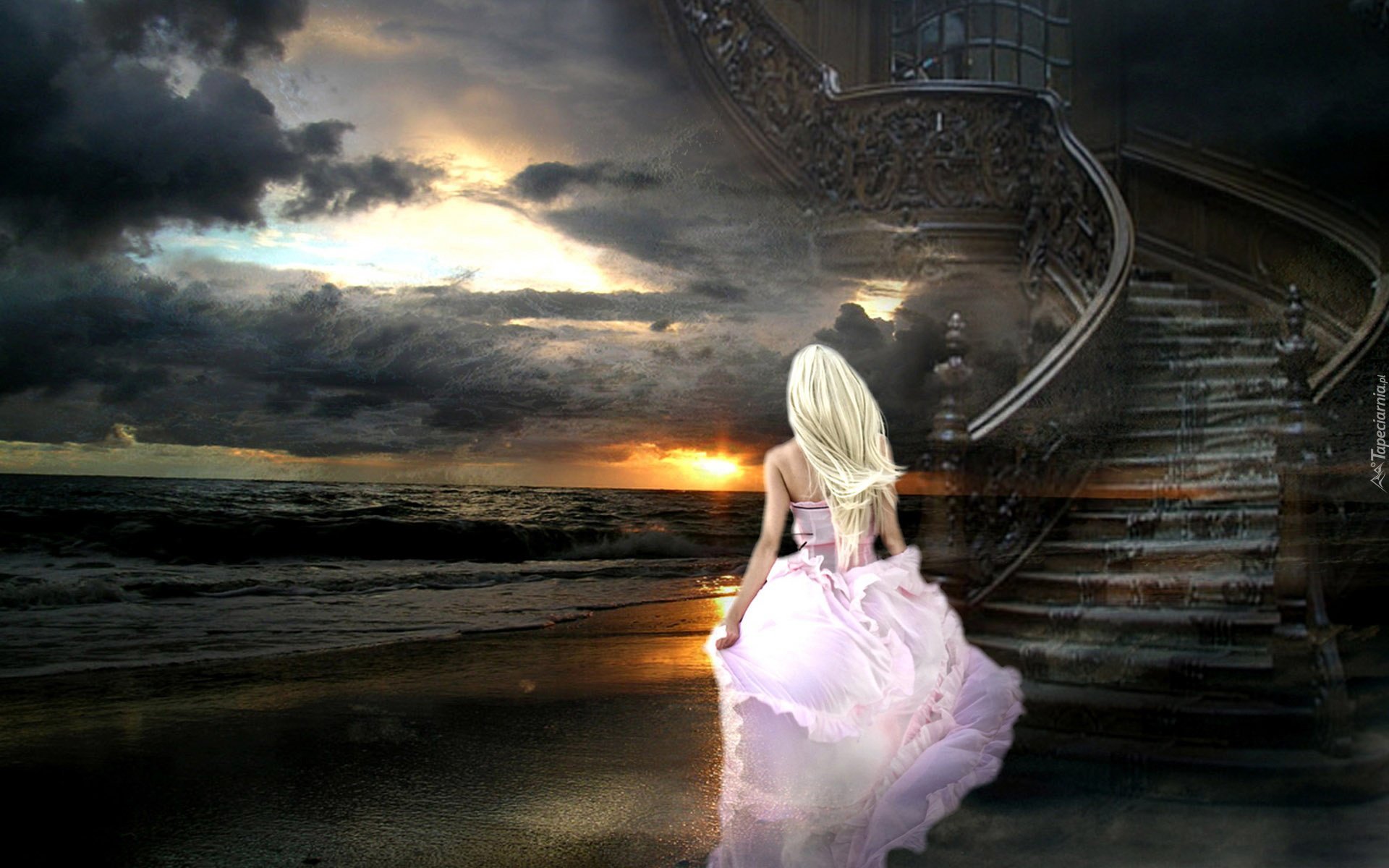 Edytor tapety: Kobieta, Schody, Woda, Chmury, Słońce