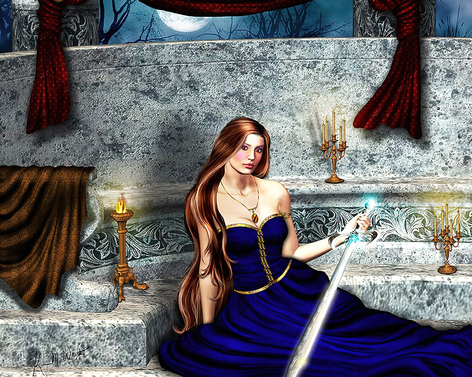 Edytor tapety: Kobieta, Miecz, Świeczniki, Księżyc
