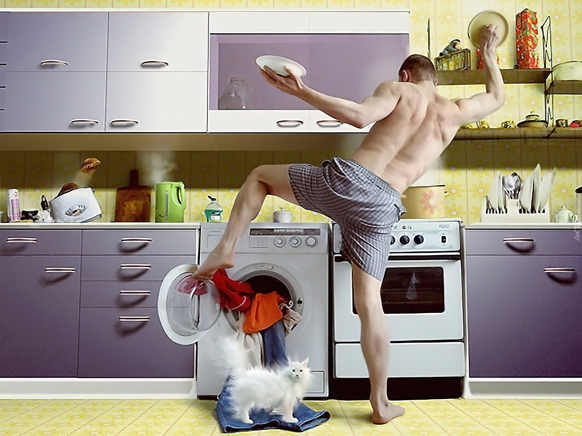 Edytor tapety: Mężczyzna, Pranie, Pralka, Kot