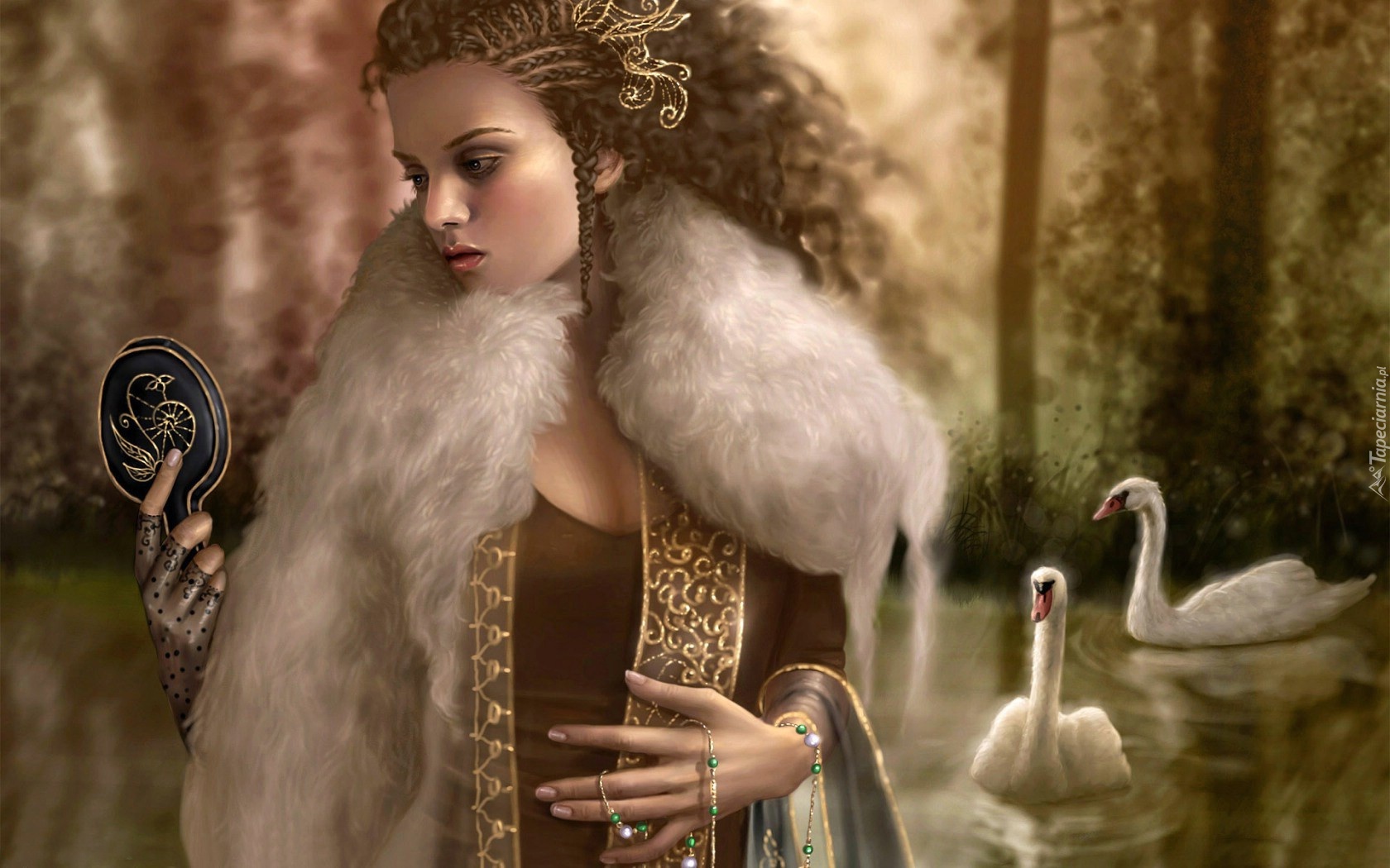Edytor tapety: Kobieta, Lusterko, Łabędzie