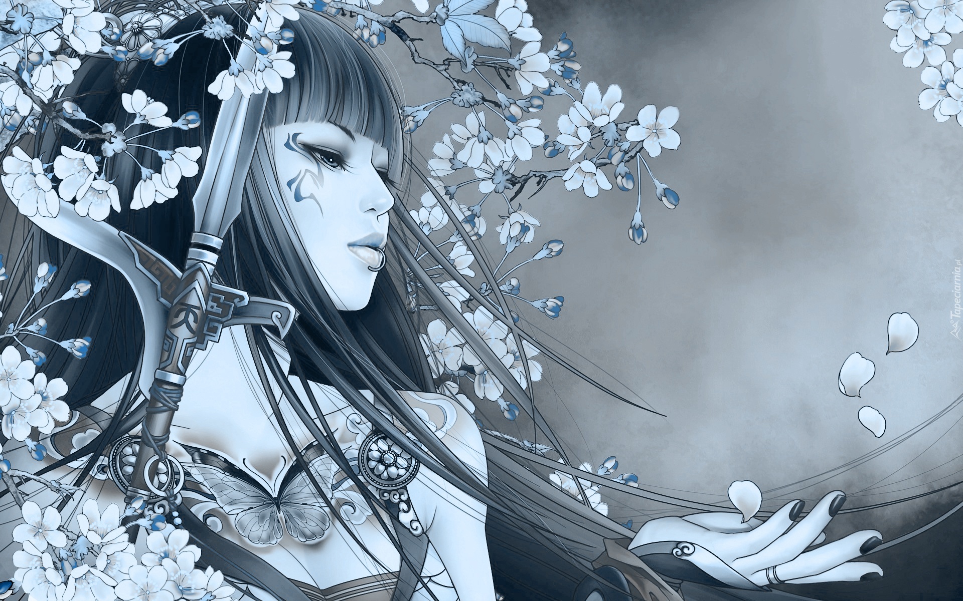 Edytor tapety: Dziewczyna, Tatuaż, Motyl, Sztylet, Kwiaty