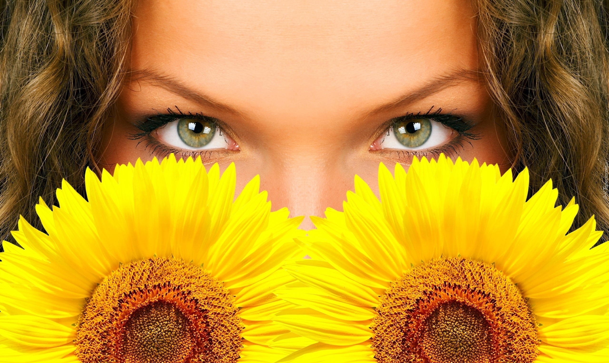 Edytor tapety: Twarz, Dziewczyny, Oczy, Dwa, Żółte, Kwiaty