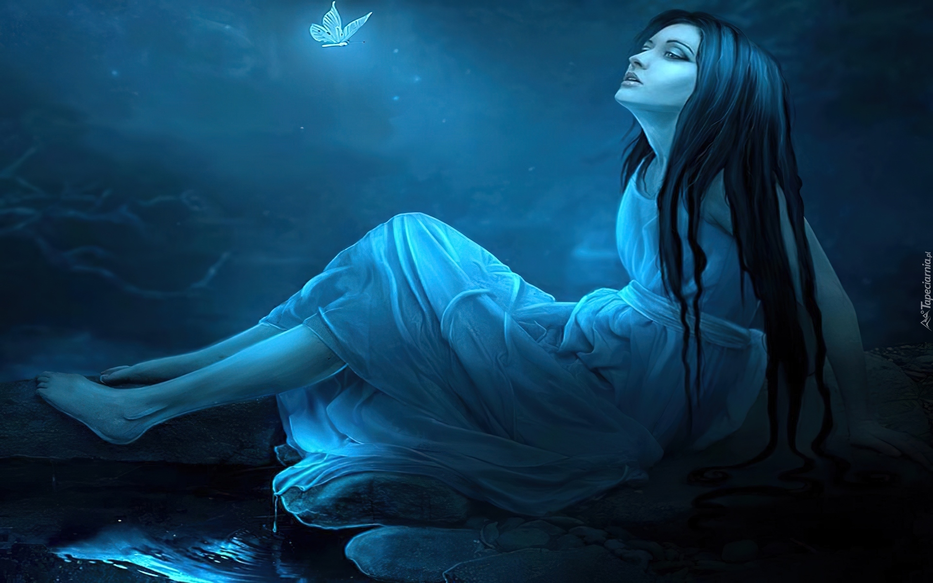Edytor tapety: Dziewczyna, Motyl, Kamienie, Woda