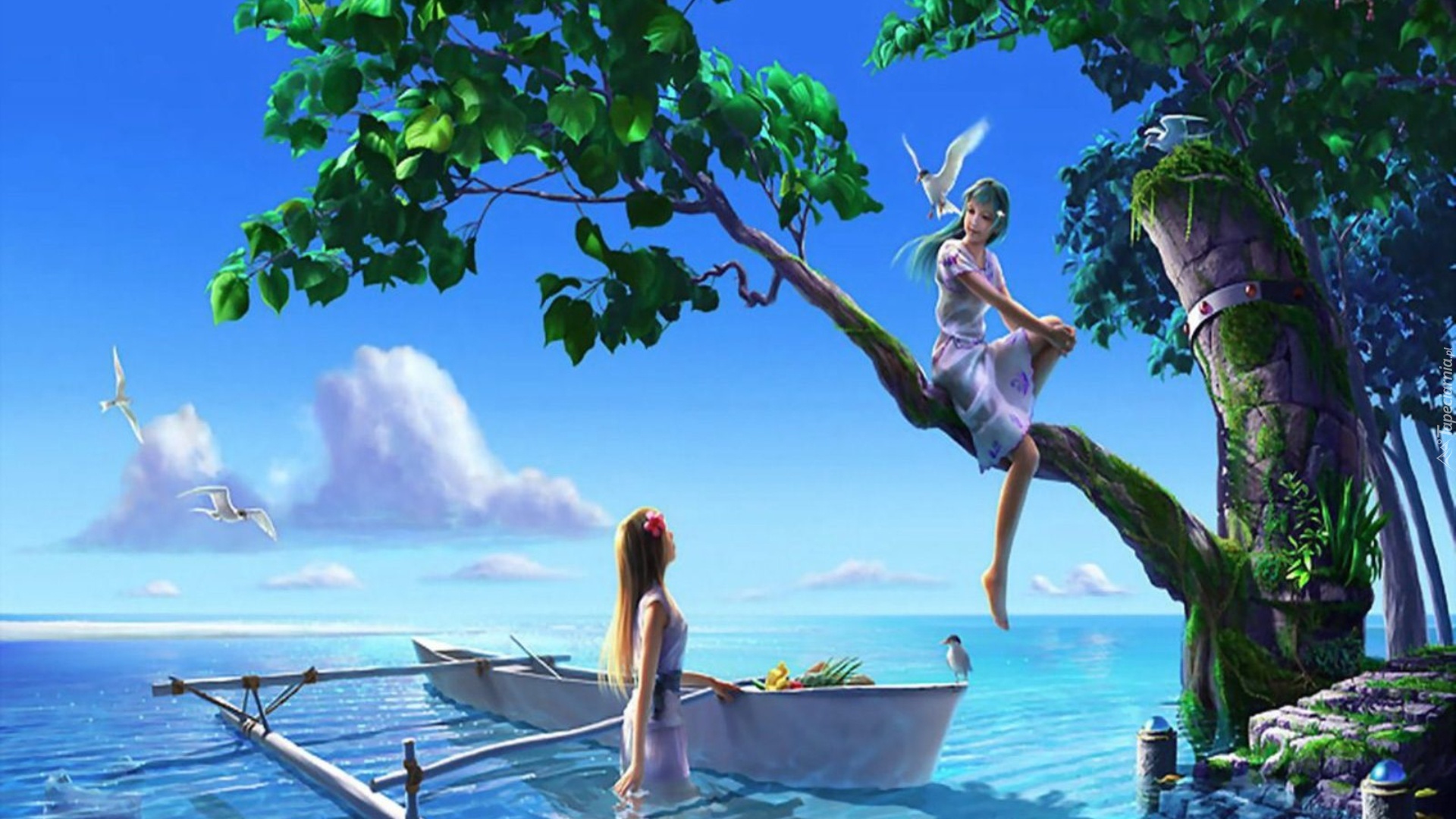 Edytor tapety: Dziewczyny, Drzewo, Woda, Łódka, Ptaki