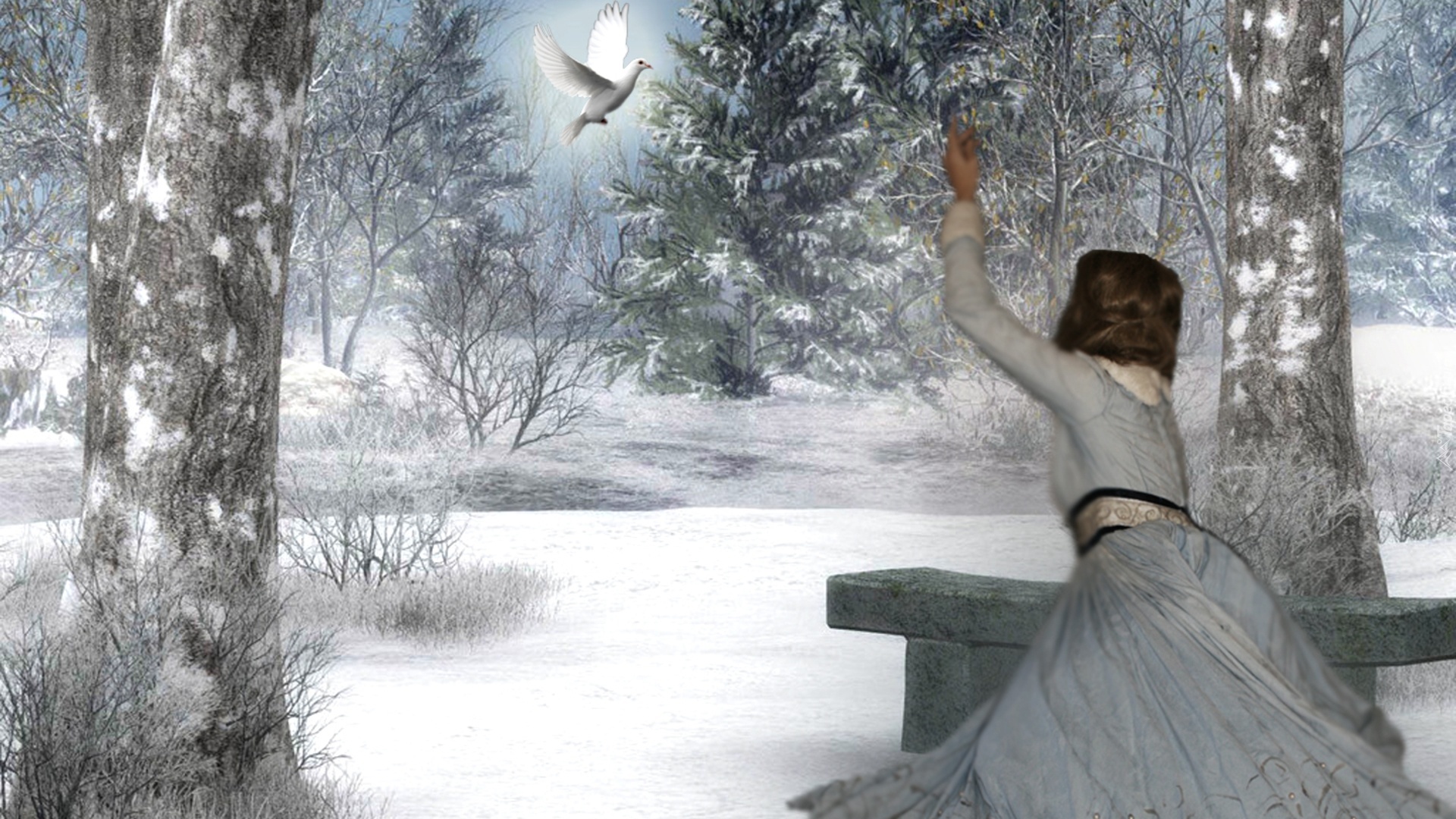 Edytor tapety: Kobieta, Ławka, Gołąb, Zima