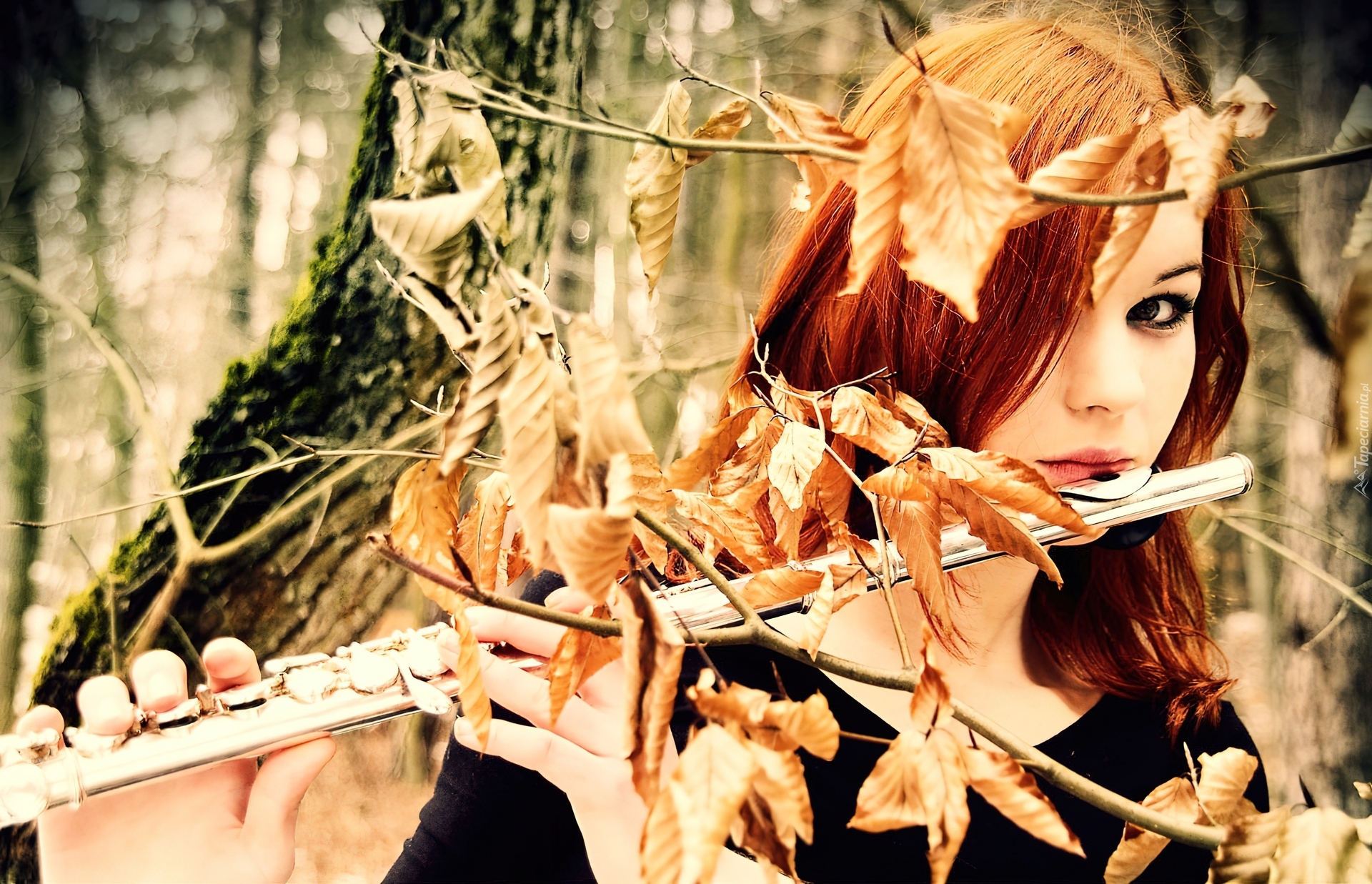 Edytor tapety: Kobieta, Flet, Liście