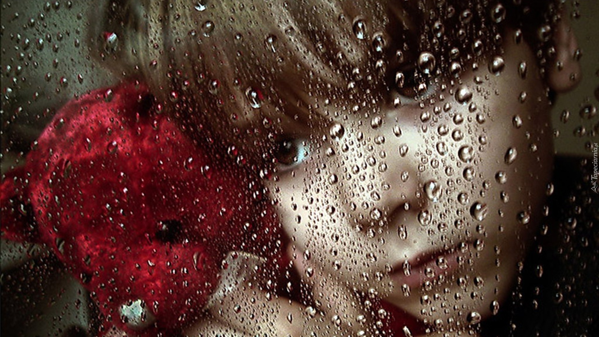 Edytor tapety: Zamyślona, Dziewczynka, Maskotka, Szyba, Deszcz