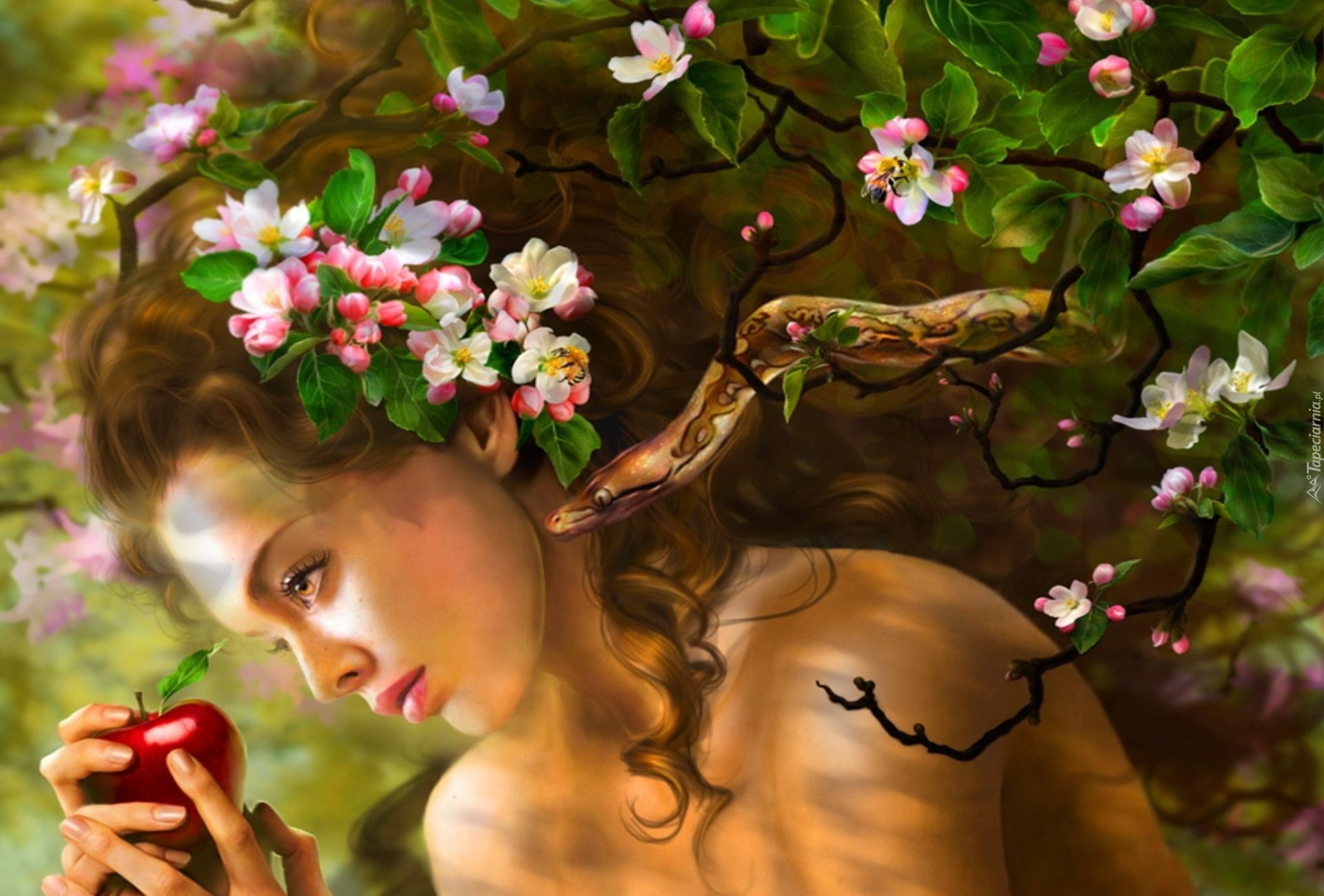 Edytor tapety: Dziewczyna, Wąż, Jabłko, Kwiat, Jabłoni