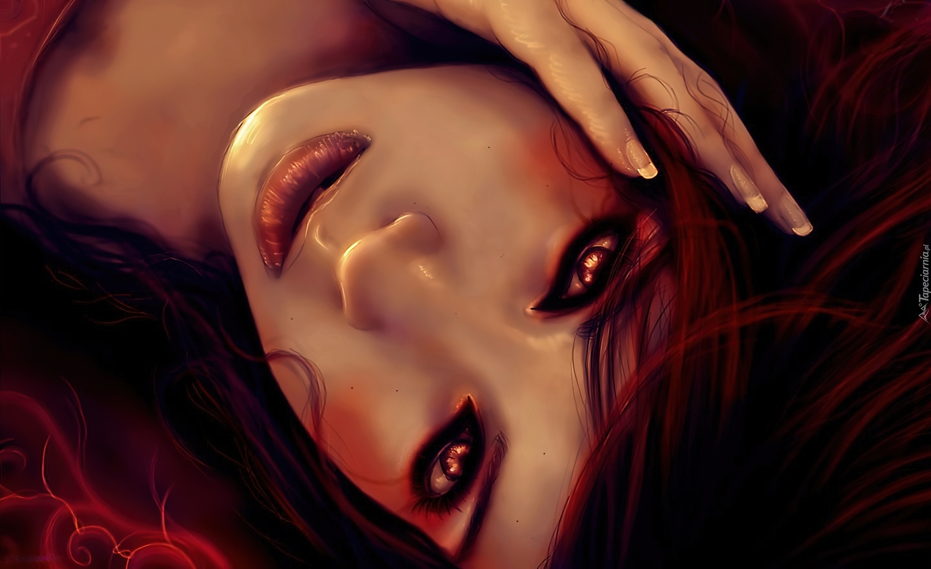 Edytor tapety: Rudowłosa, Kobieta, Makijaż, Ręka
