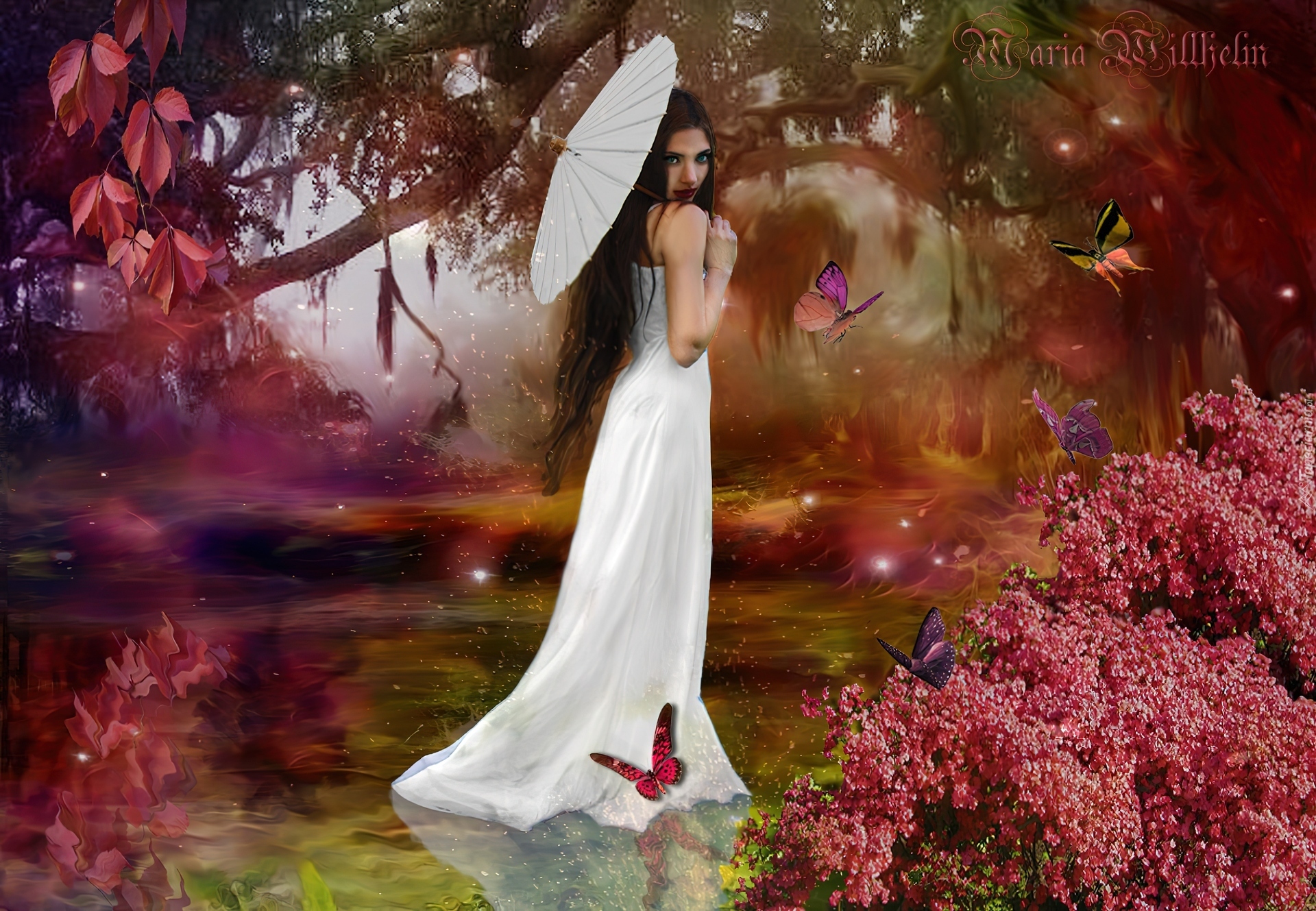 Edytor tapety: Dziewczyna, Parasol, Woda, Kwiaty