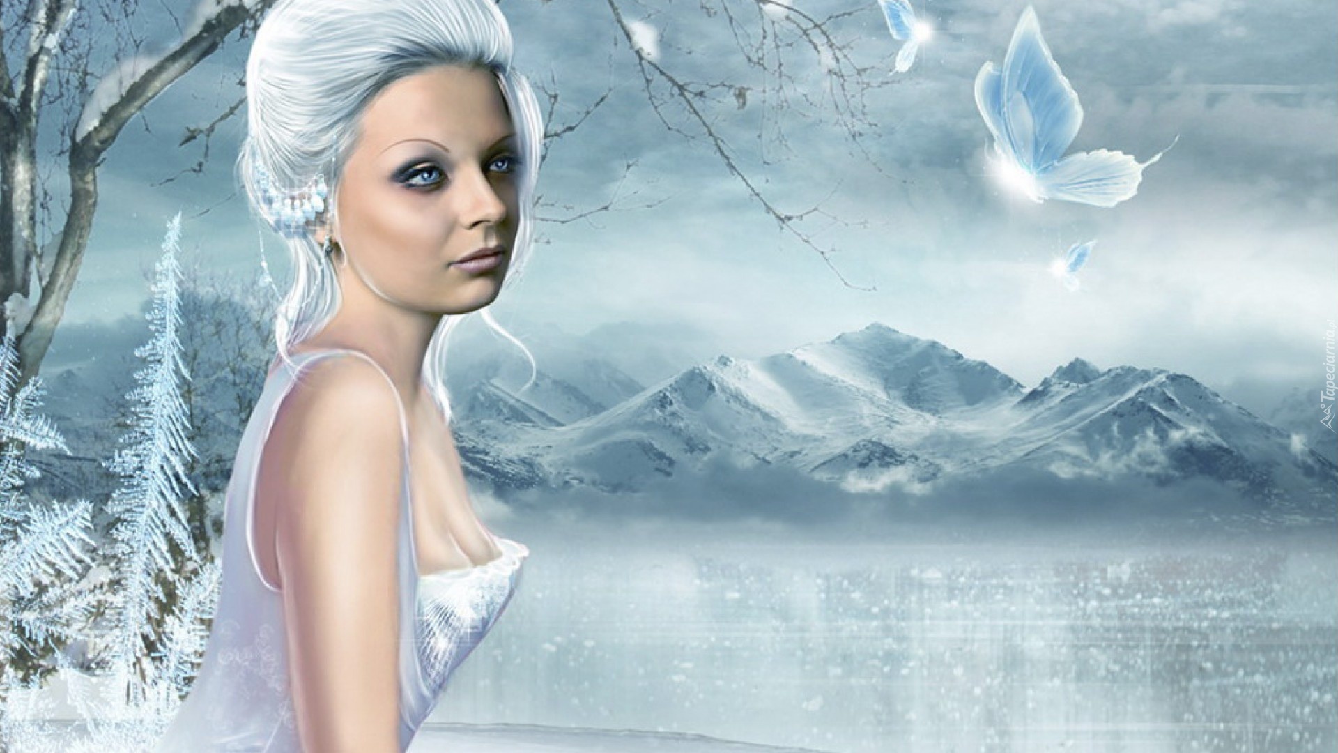 Edytor tapety: Kobieta, Woda, Góry, Motyle