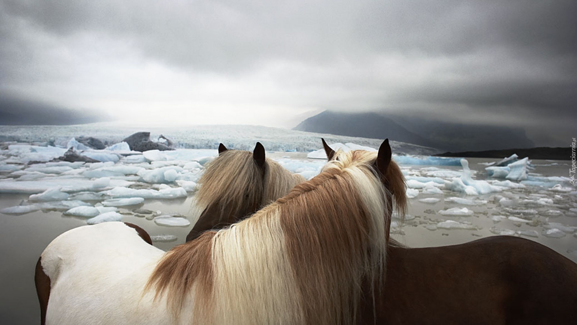 Edytor tapety: Dwa, Konie, Woda, Góry, Lód