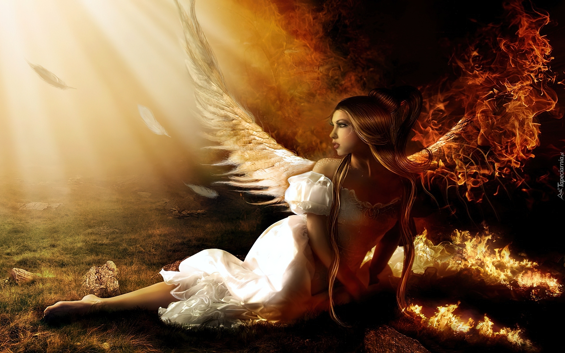 Edytor tapety: Dziewczyna, Anioł, Pióra, Ogień