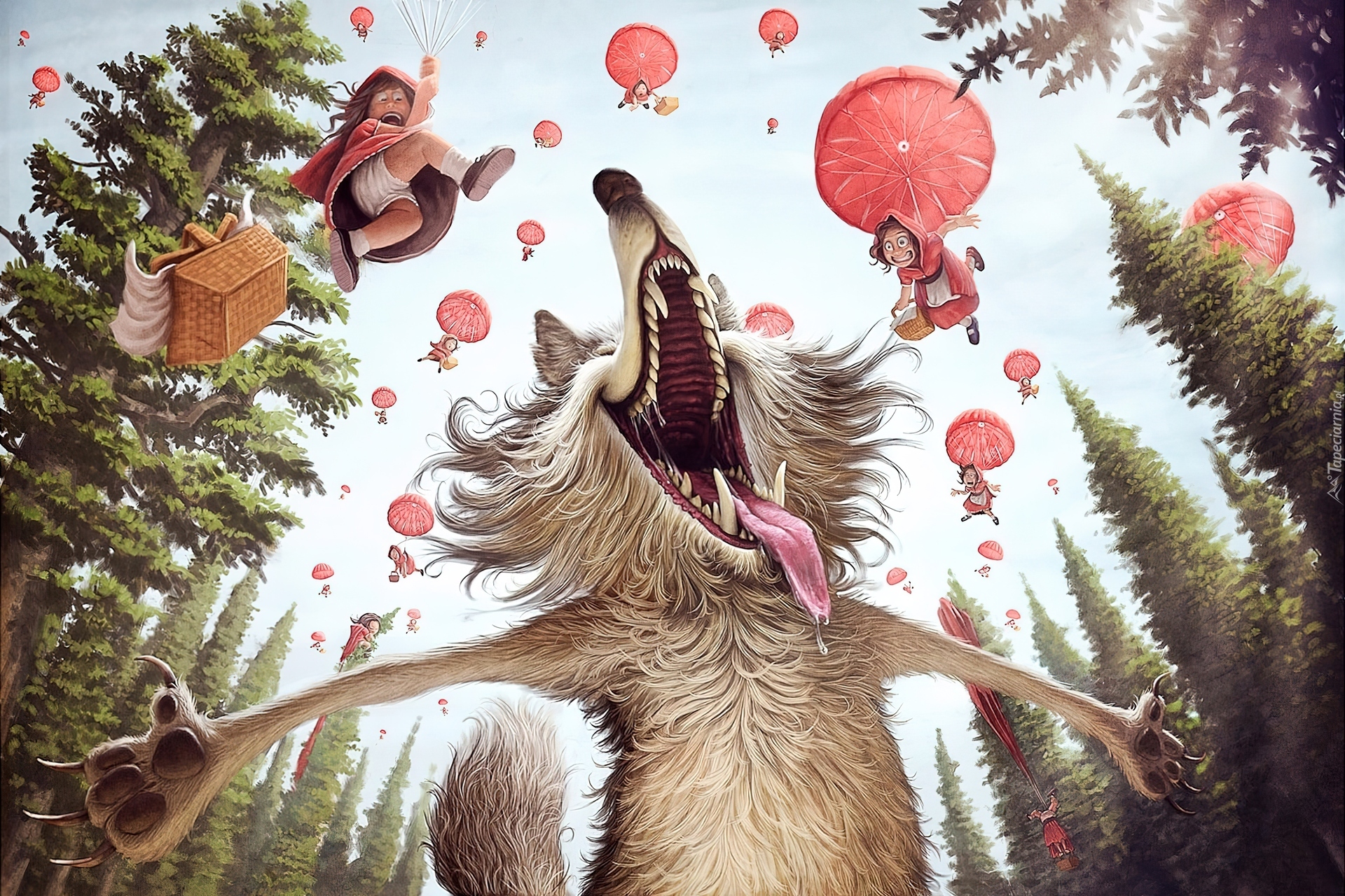 Edytor tapety: Wilk, Czerwone, Kapturki, Spadochrony