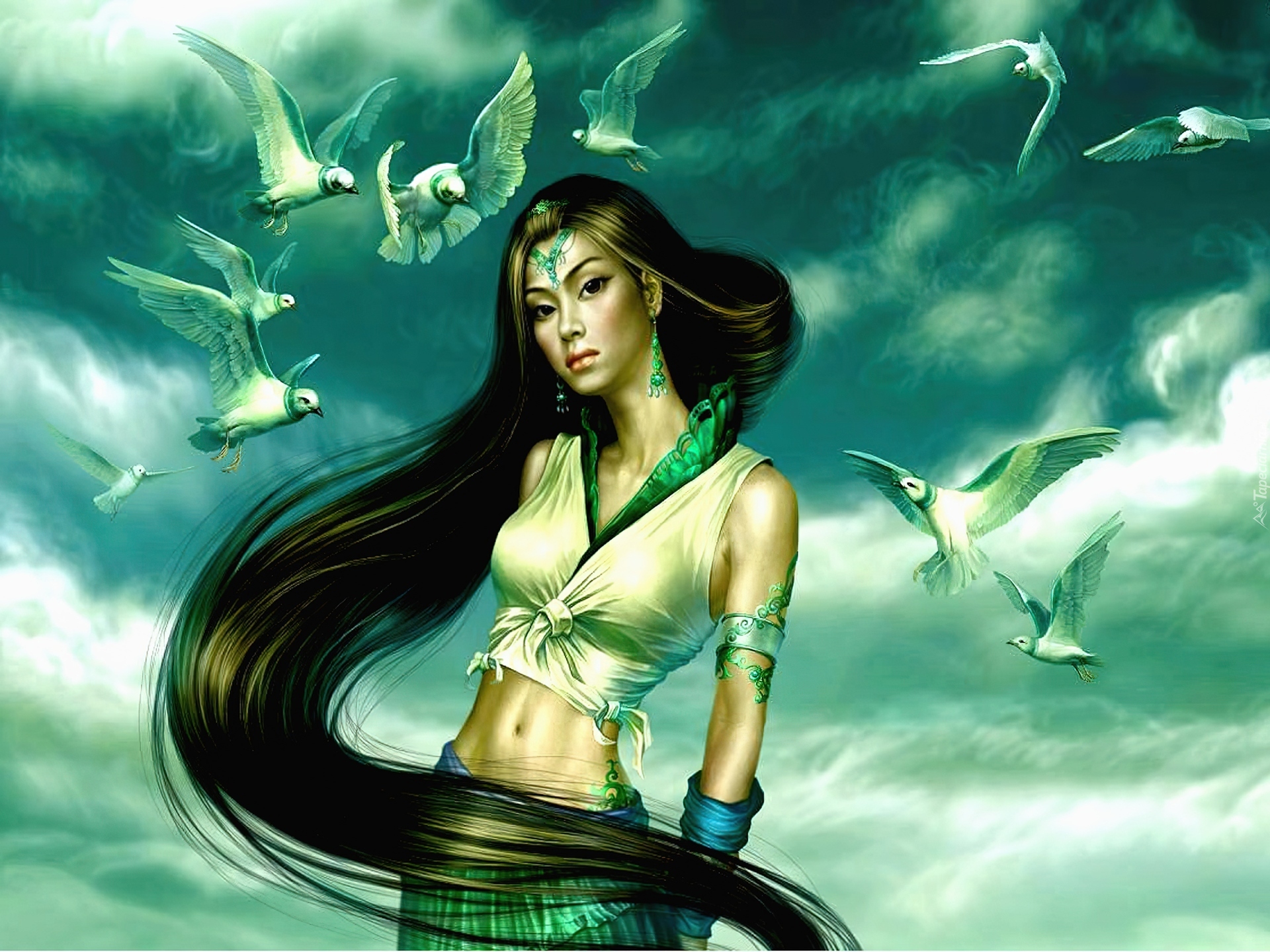 Edytor tapety: Dziewczyna, Włosy, Ptaki