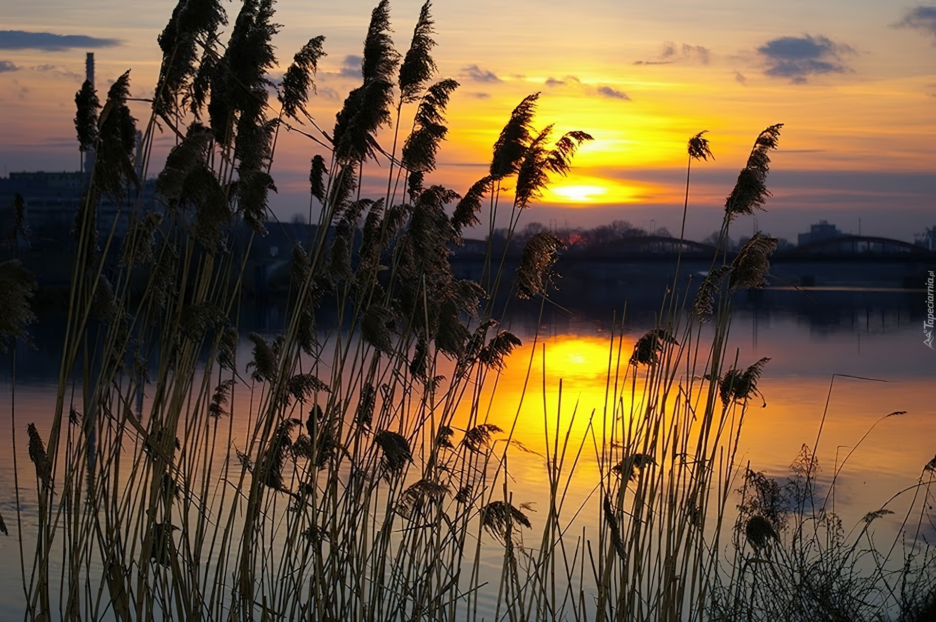Edytor tapety: Jezioro, Zachód, Słońca, Trzcina