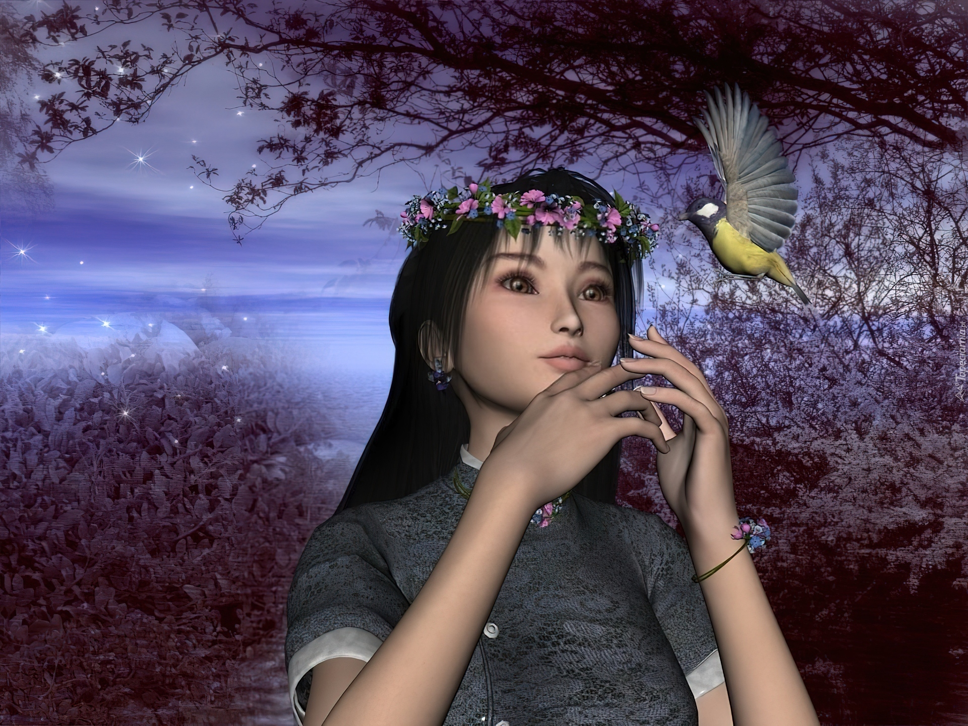 Edytor tapety: Dziewczyna, Wianek, Ptaszek
