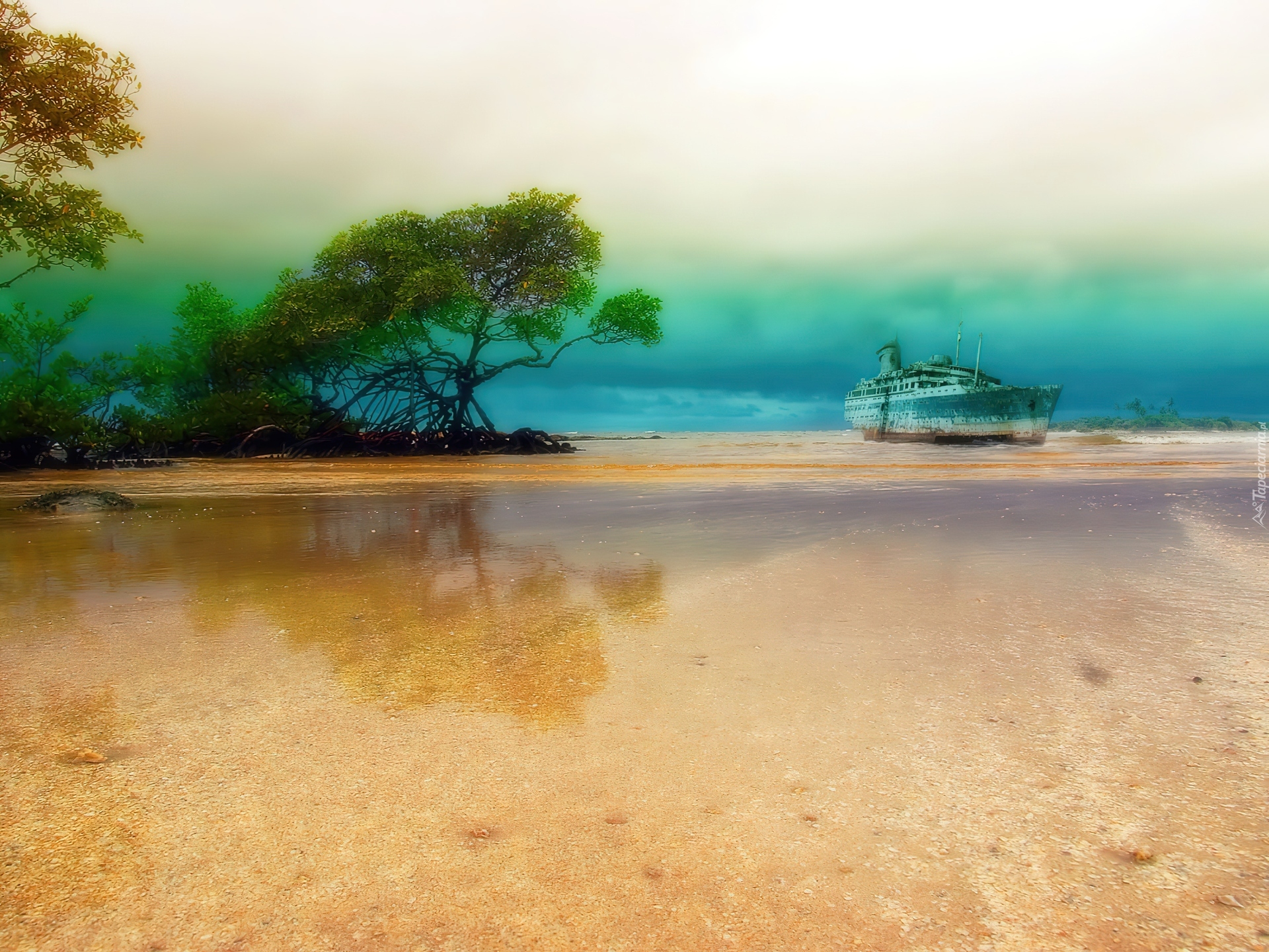 Edytor tapety: Morze, Wrak, Statku, Drzewa