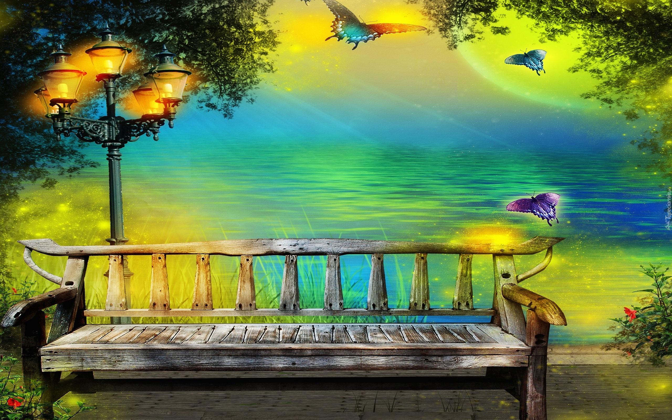 Edytor tapety: Motyle, Ławka, Latarnia