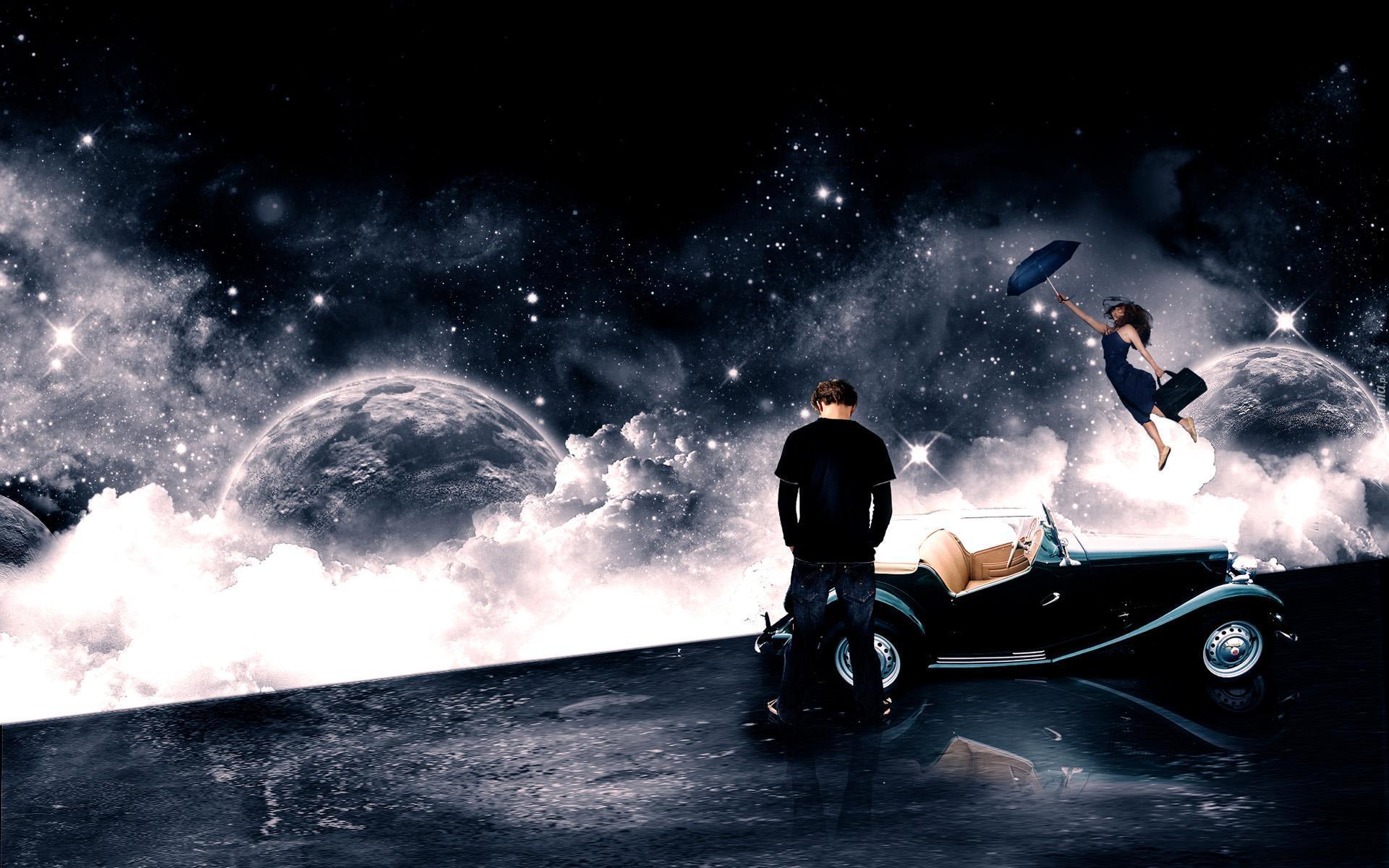 Edytor tapety: Planety, Chmury, Parasolka, Samochód, Ludzie