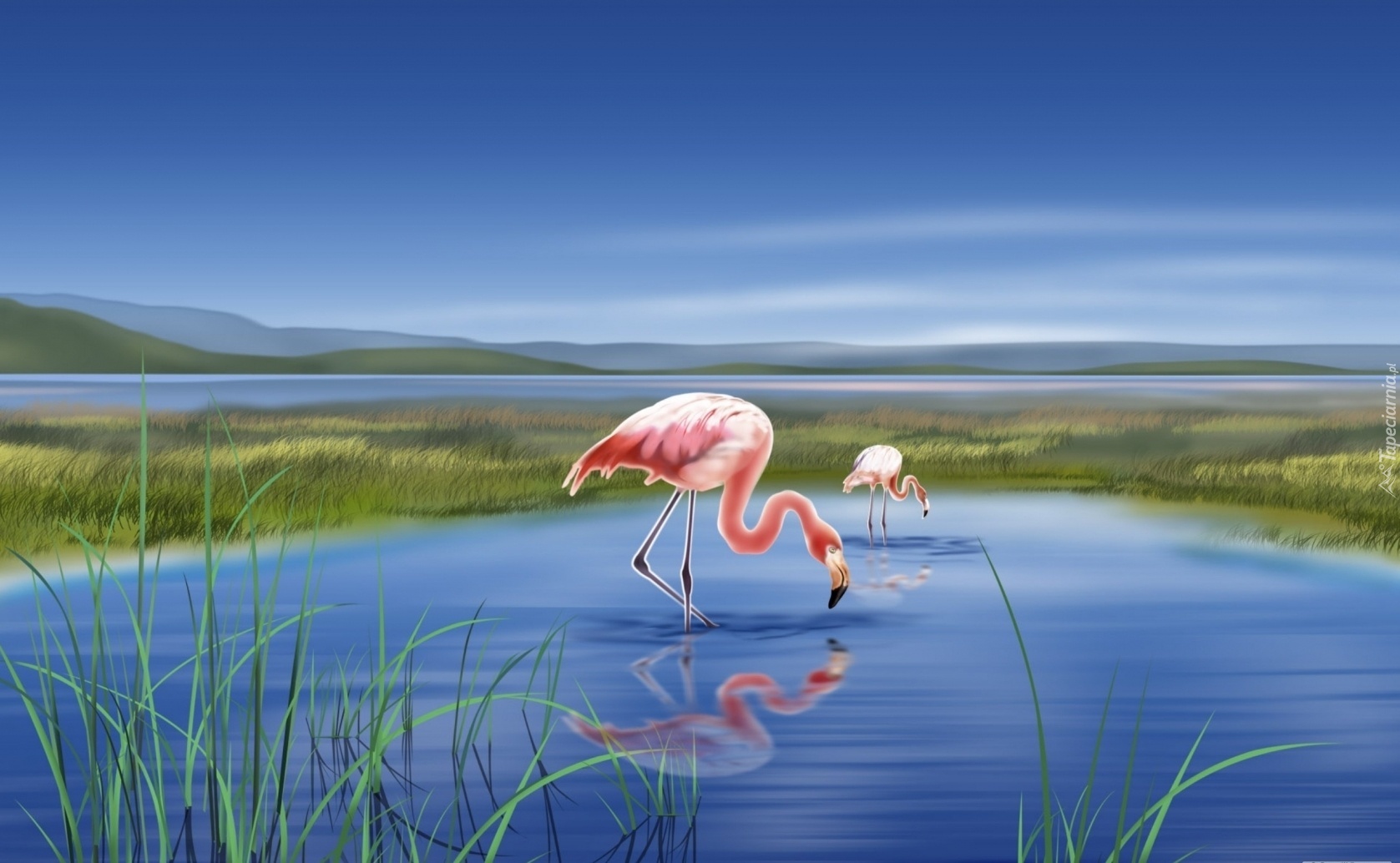 Edytor tapety: Jezioro, Dwa, Flamingi, Grafika 2D