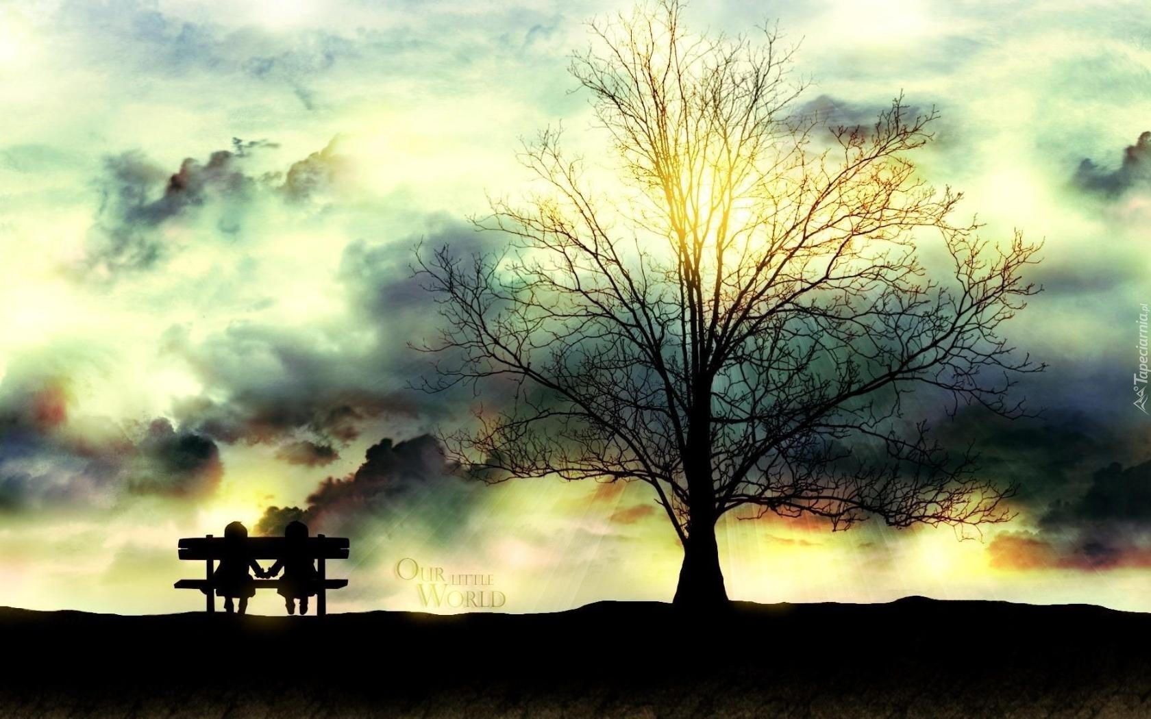 Edytor tapety: Drzewo, Ławeczka, Dwie, Dziewczynki, Noc