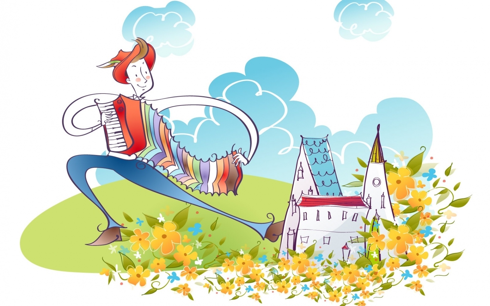 Edytor tapety: Mężczyzna, Instrument, Akordeon, Kwiaty, Chmury