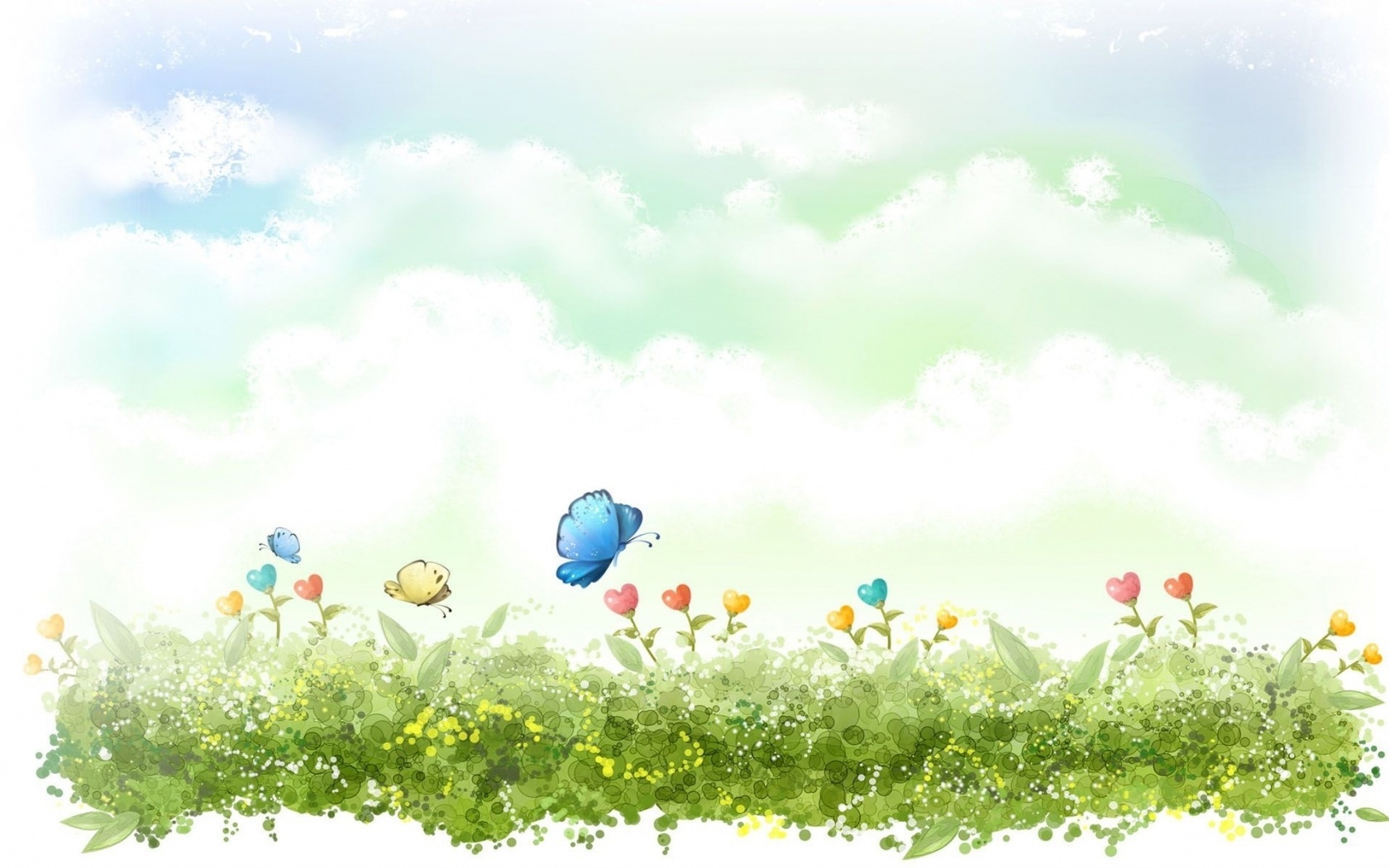 Edytor tapety: Łąka, Kwiaty, Serca, Motyl, Chmury, Grafika