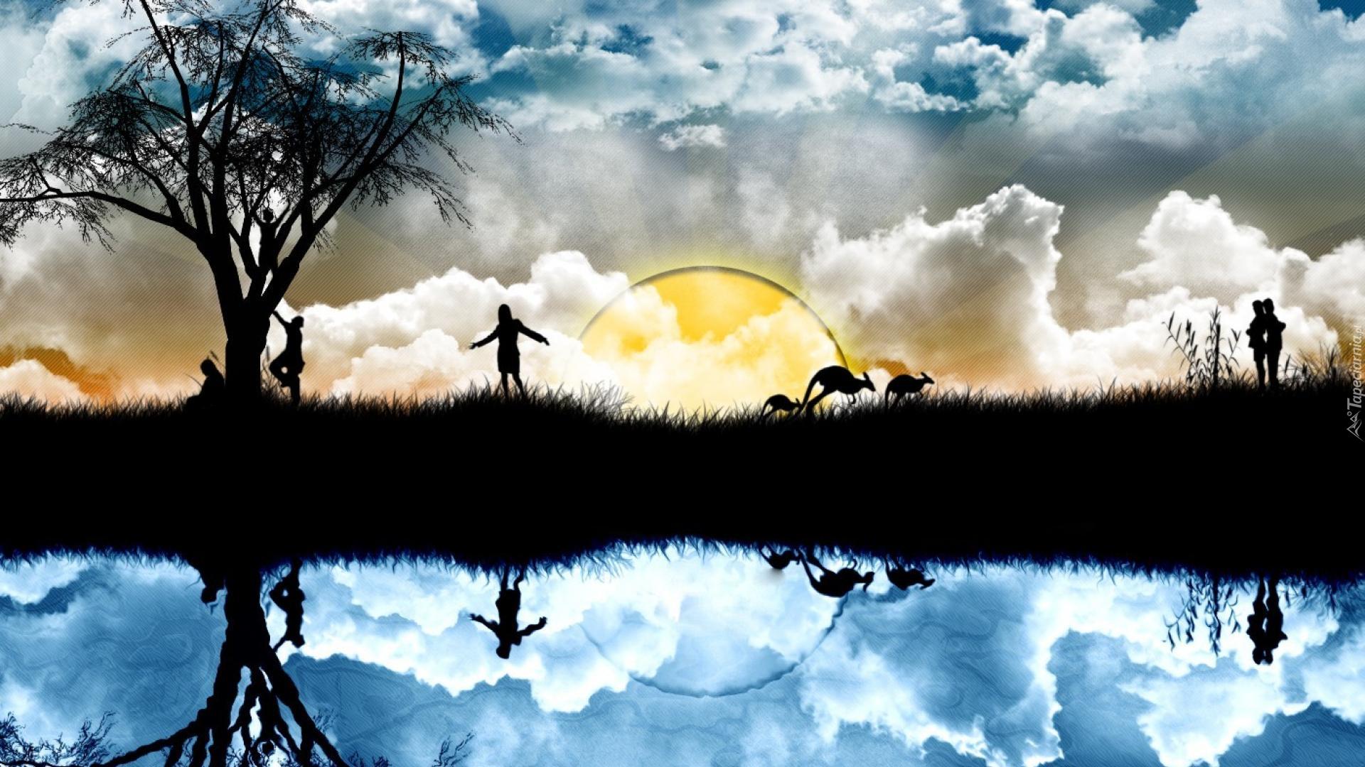 Edytor tapety: Ludzie, Drzewo, Rzeka, Odbicie, Słońce, Chmury, Grafika