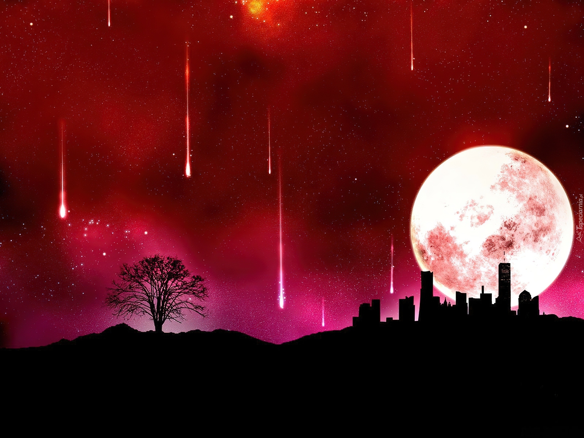 Edytor tapety: Noc, Drzewo, Miasto, Księżyc, Spadające, Gwiazdy
