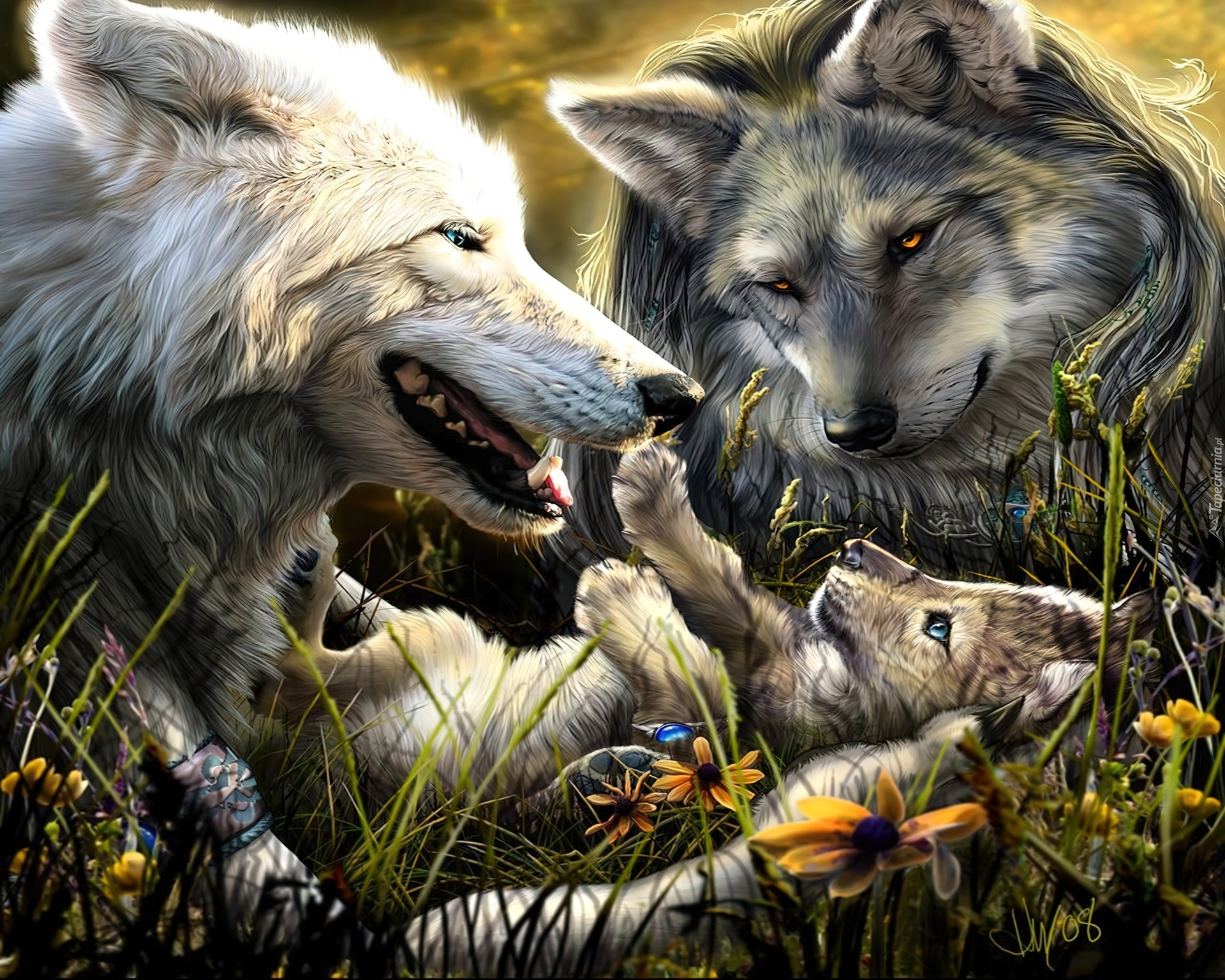 Edytor tapety: Trzy, Wilki, Rodzina, Łąka