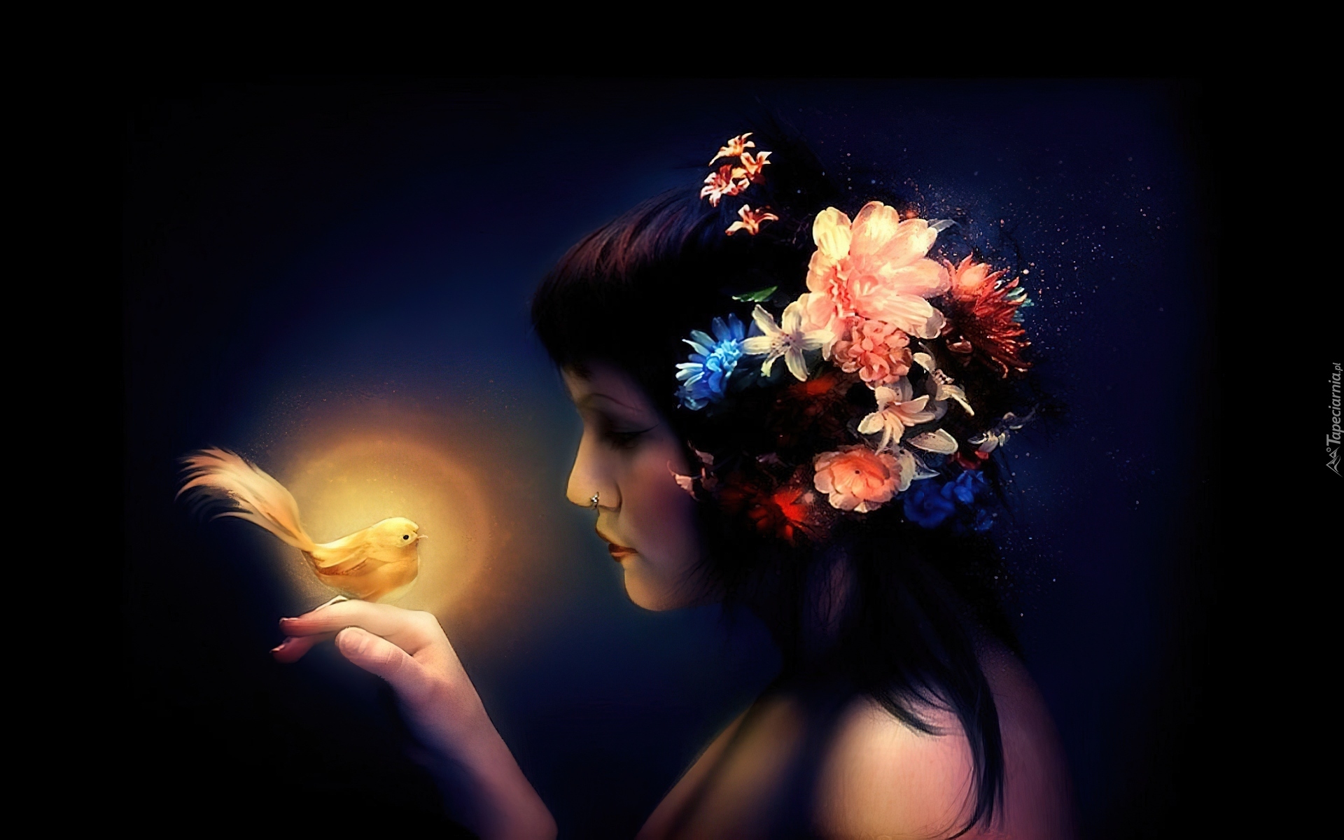 Edytor tapety: Kobieta, Kwiaty, Włosy, Ptak