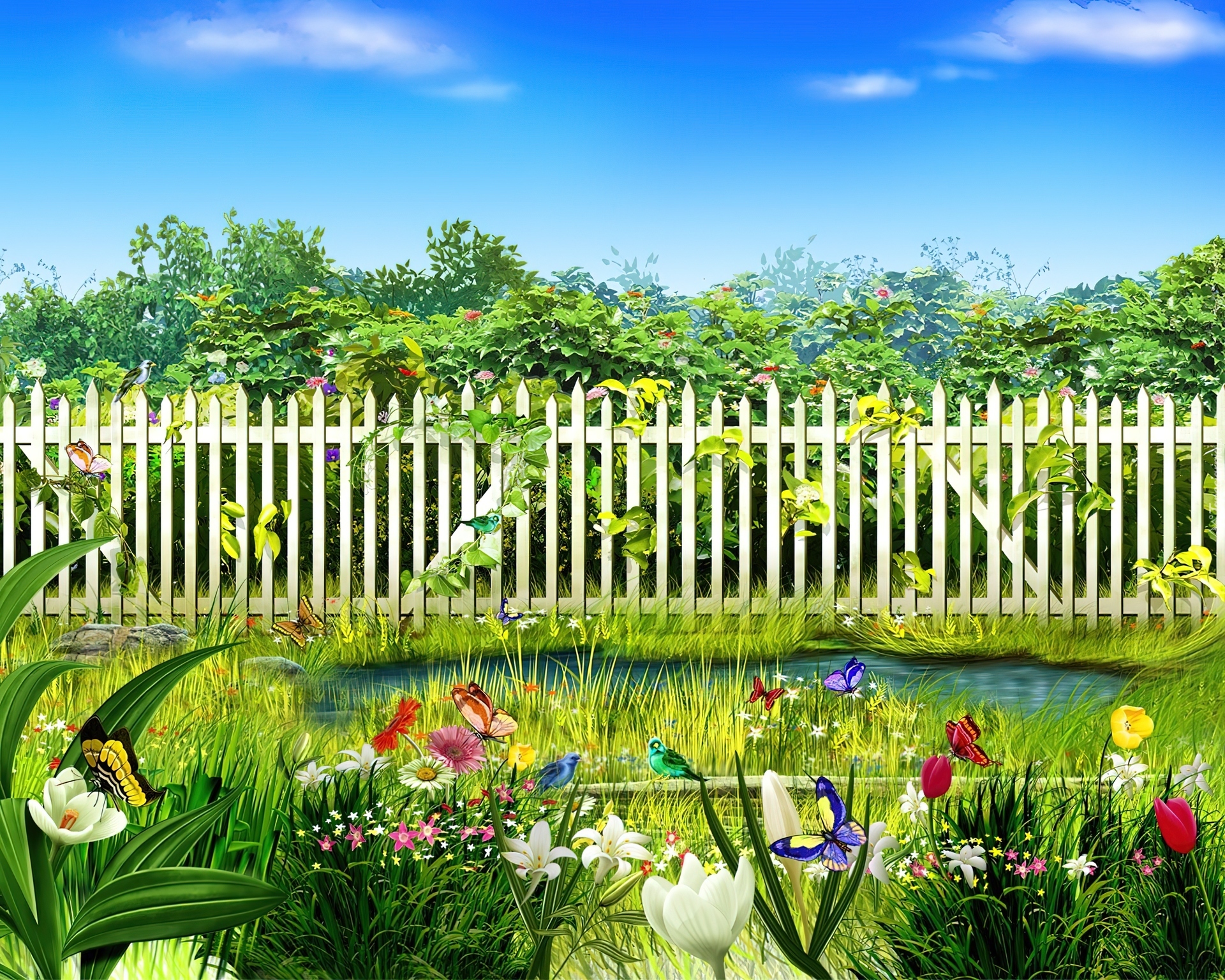 Edytor tapety: Ogród, Kwiaty, Bajorko, Motyle, Ptaki, Płot
