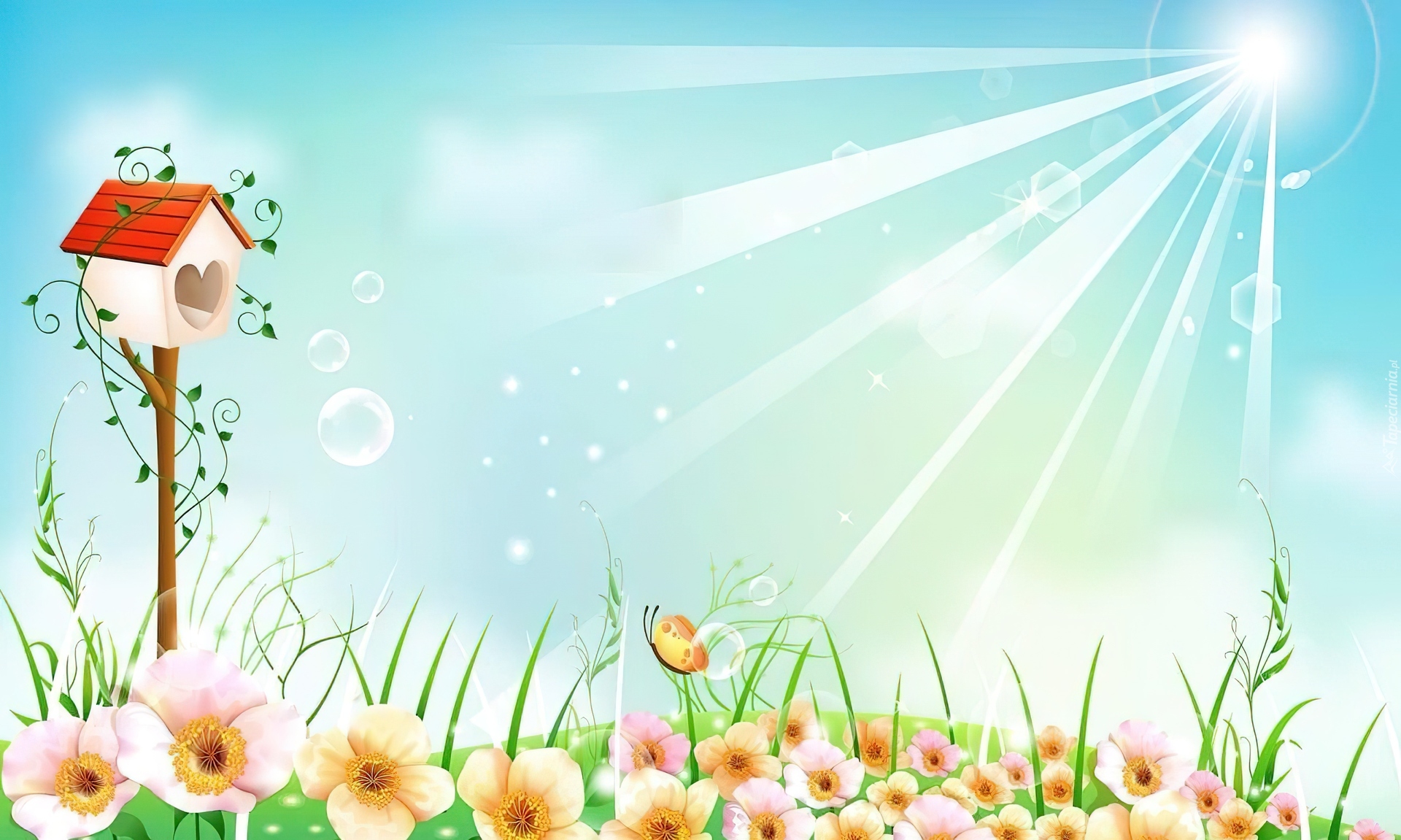 Edytor tapety: Łąka, Kwiaty, Karmnik, Słońce, Promienie