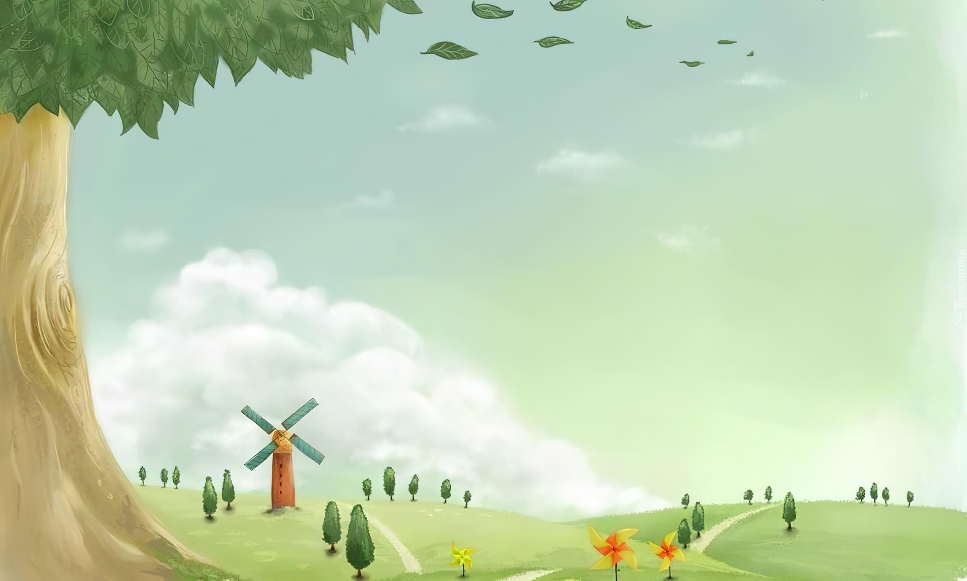 Edytor tapety: Drzewa, Łąka, Wiatrak, Chmury