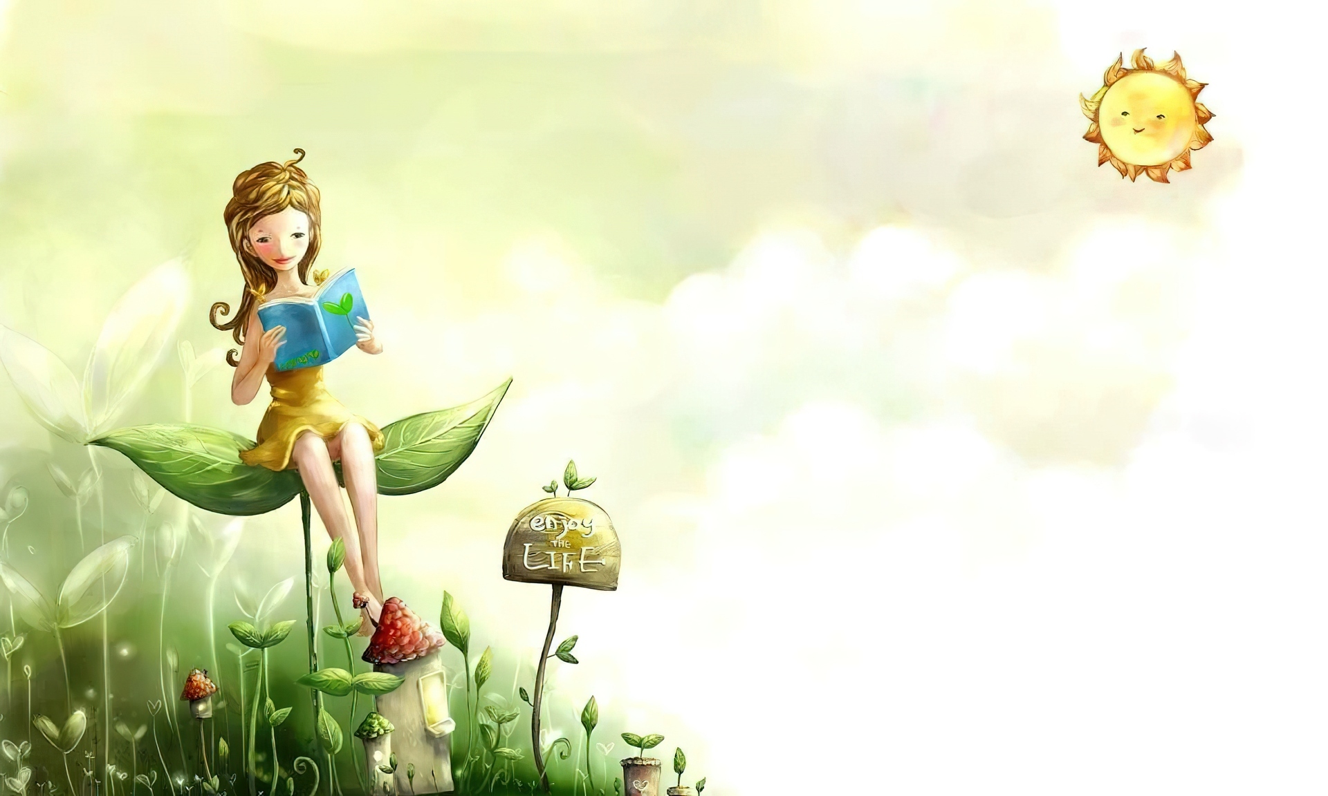 Edytor tapety: Zielone, Roślinki, Dziewczynka, Książka, Słońce