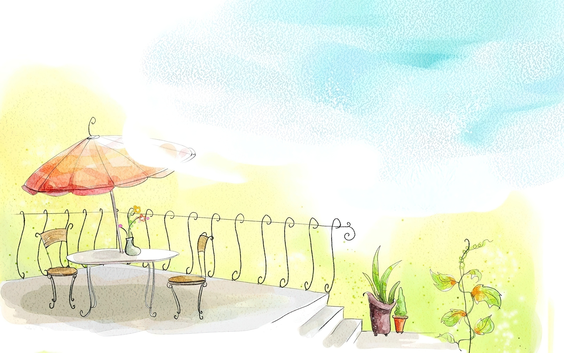 Edytor tapety: Taras, Stolik, Parasol, Kwiaty, Rysunek