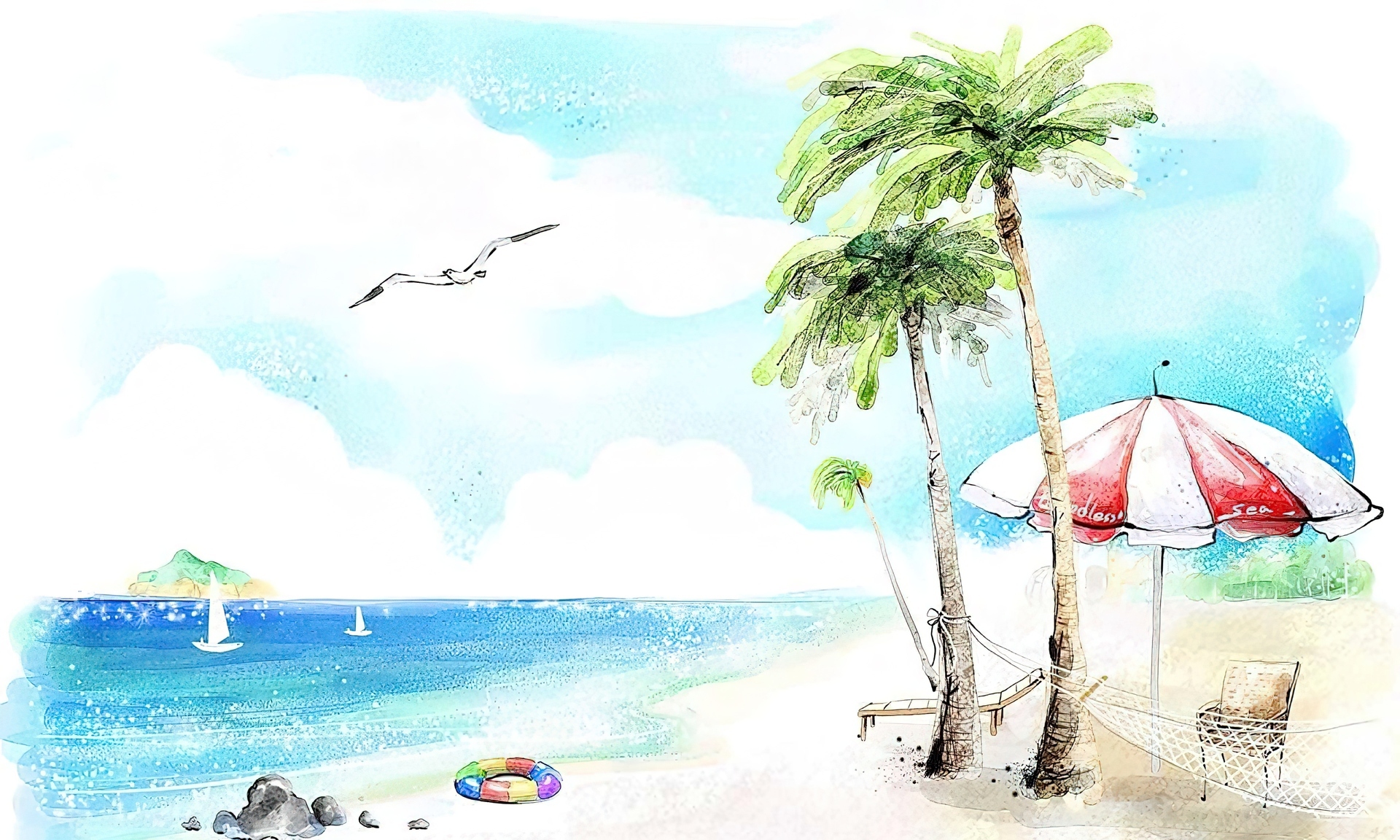 Edytor tapety: Plaża, Palmy, Parasol, Morze Rysunek