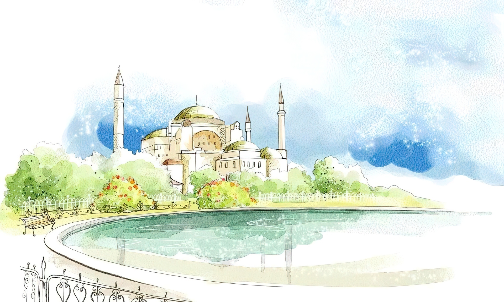 Edytor tapety: Sadzawka, Krzewy, Budowle