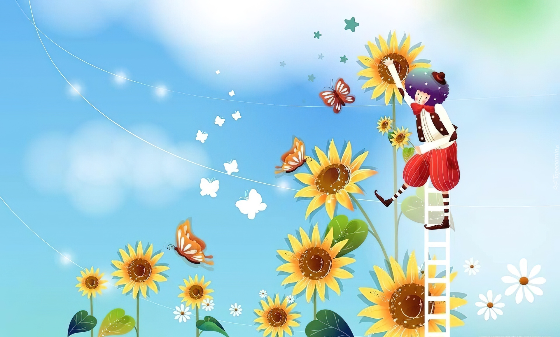 Edytor tapety: Słoneczniki, Drabina, Pajacyk, Motyle