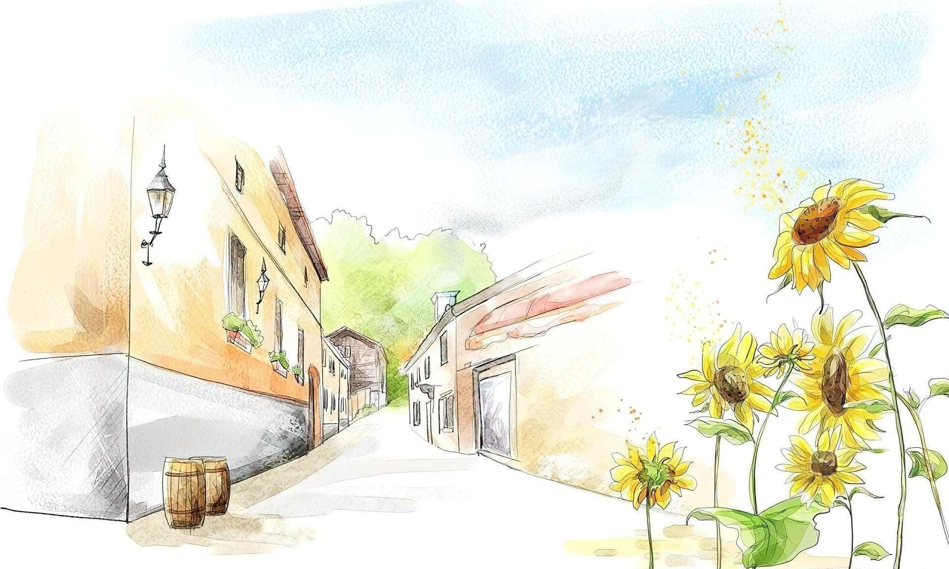 Edytor tapety: Miasteczko, Uliczka, Słoneczniki