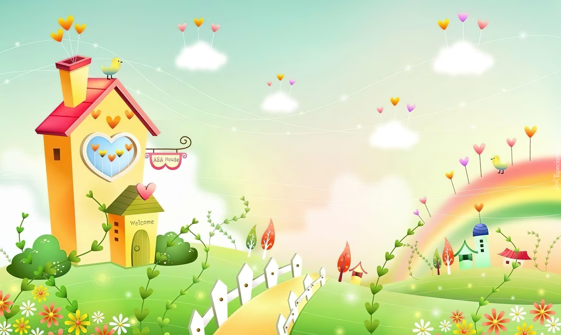 Edytor tapety: Kraina, Fantazji, Domy, Droga, Kwiaty, Tęcza