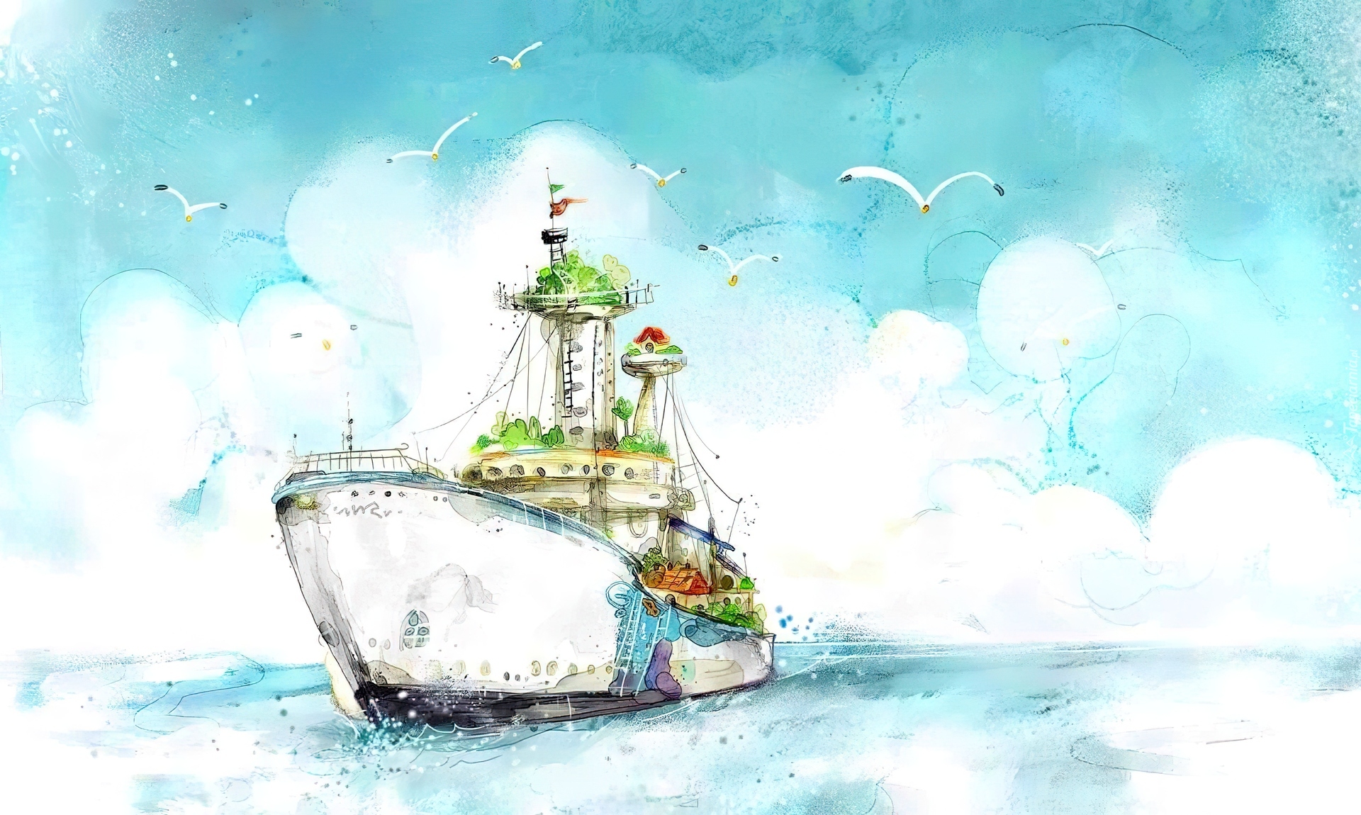 Edytor tapety: Morze, Statek, Mewy