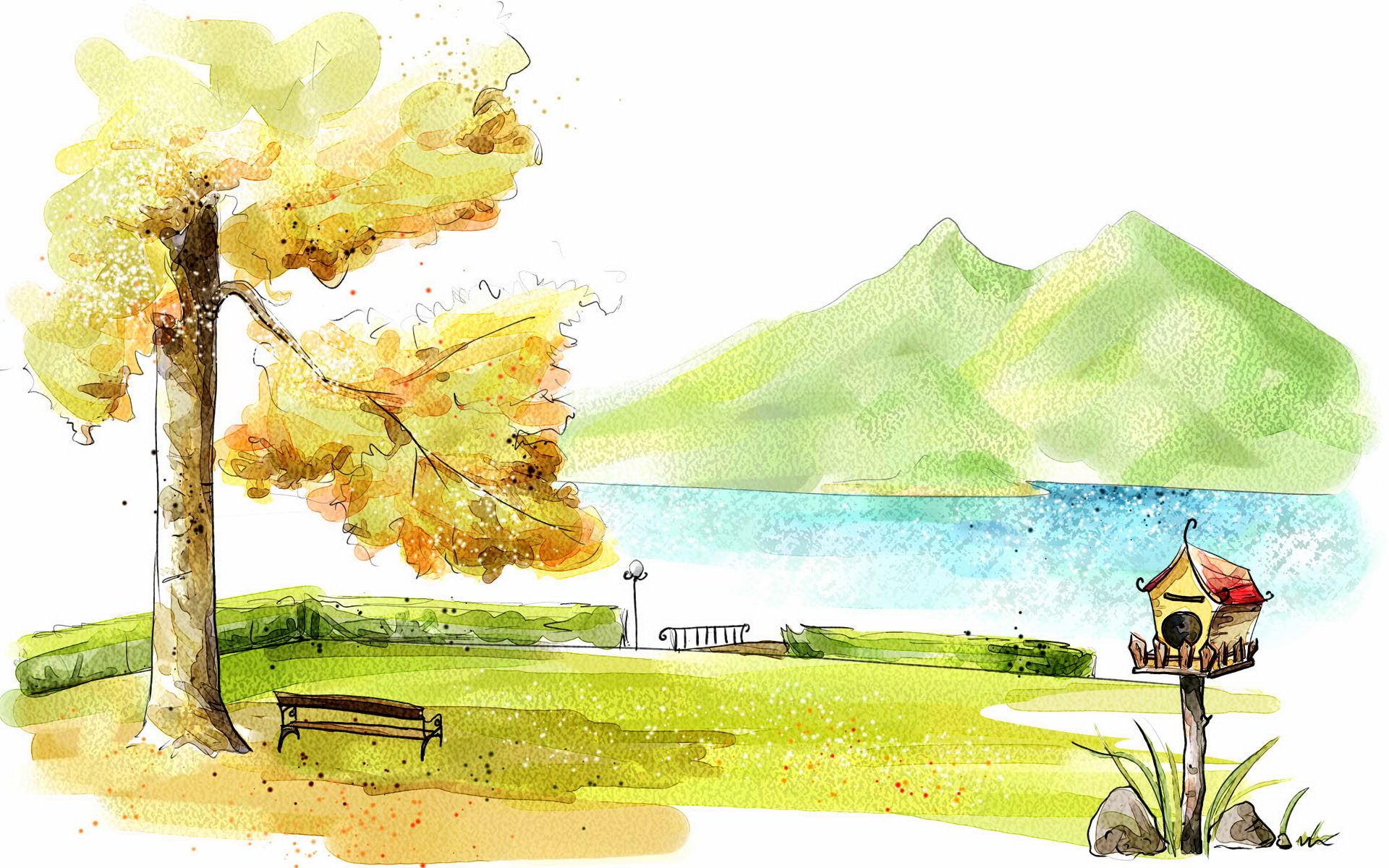 Edytor tapety: Jesień, Drzewo, Pole, Rzeka, Góry