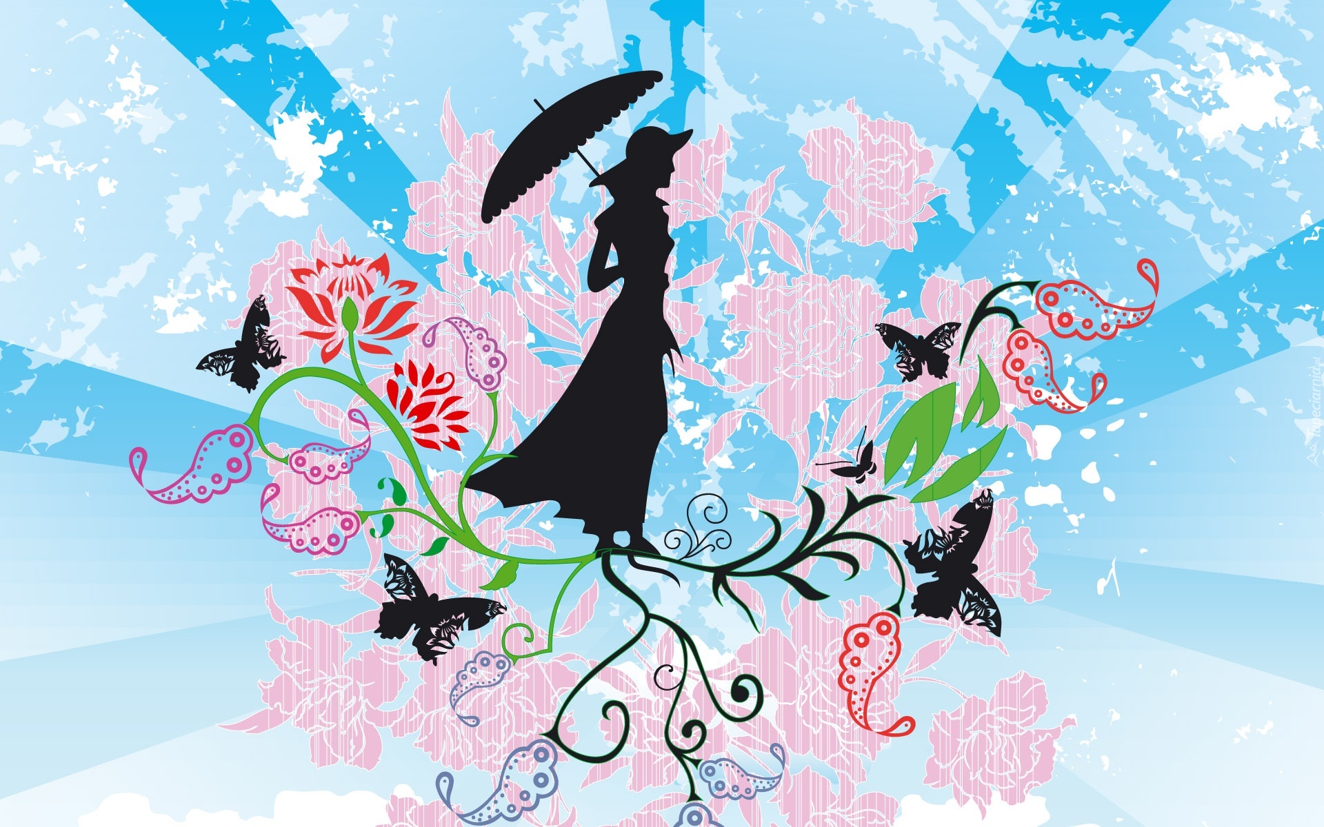 Edytor tapety: Kwiaty, Kobieta, Parasol, Motyle
