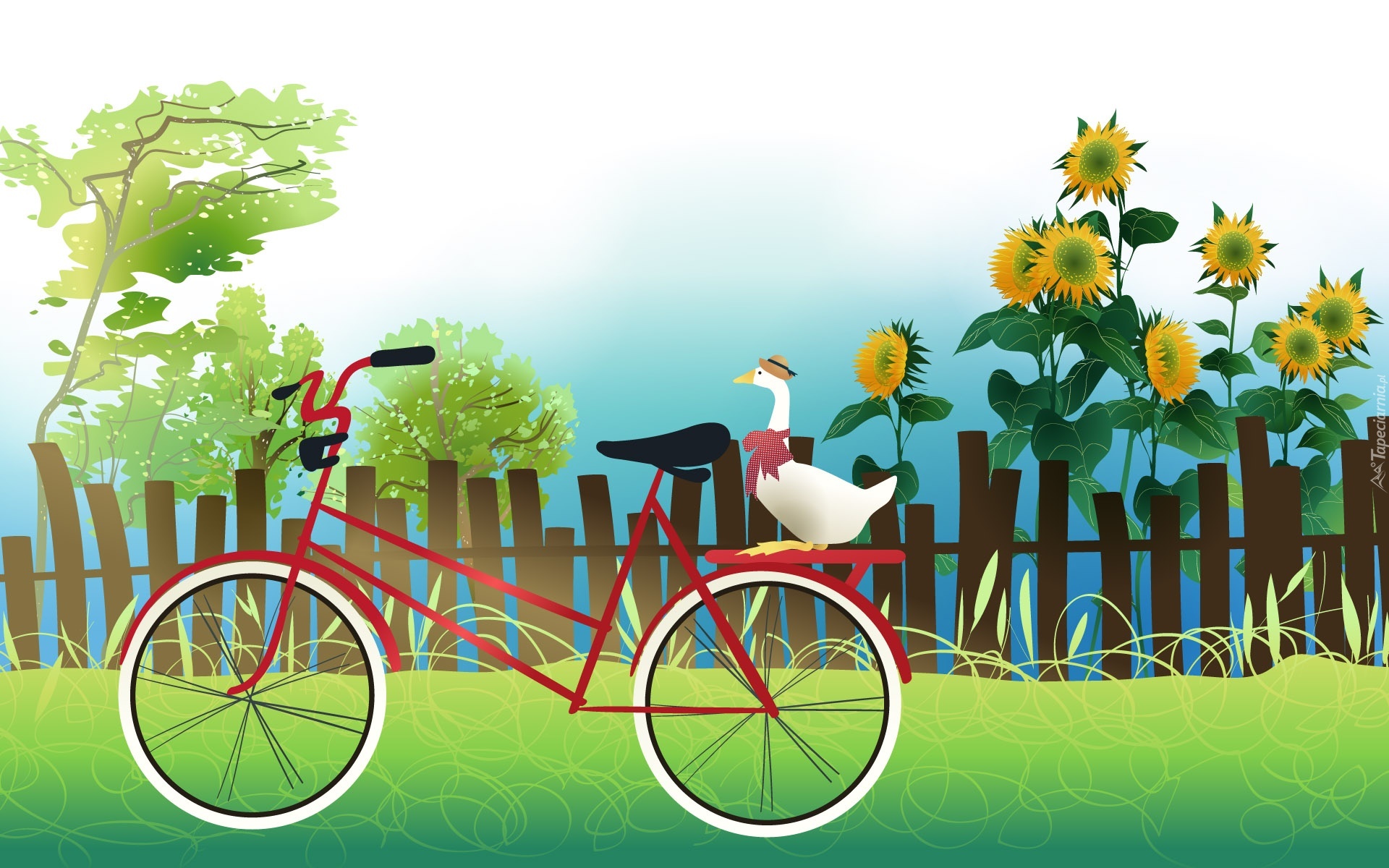 Edytor tapety: Rower, Gęś, Płot, Słoneczniki, Drzewa
