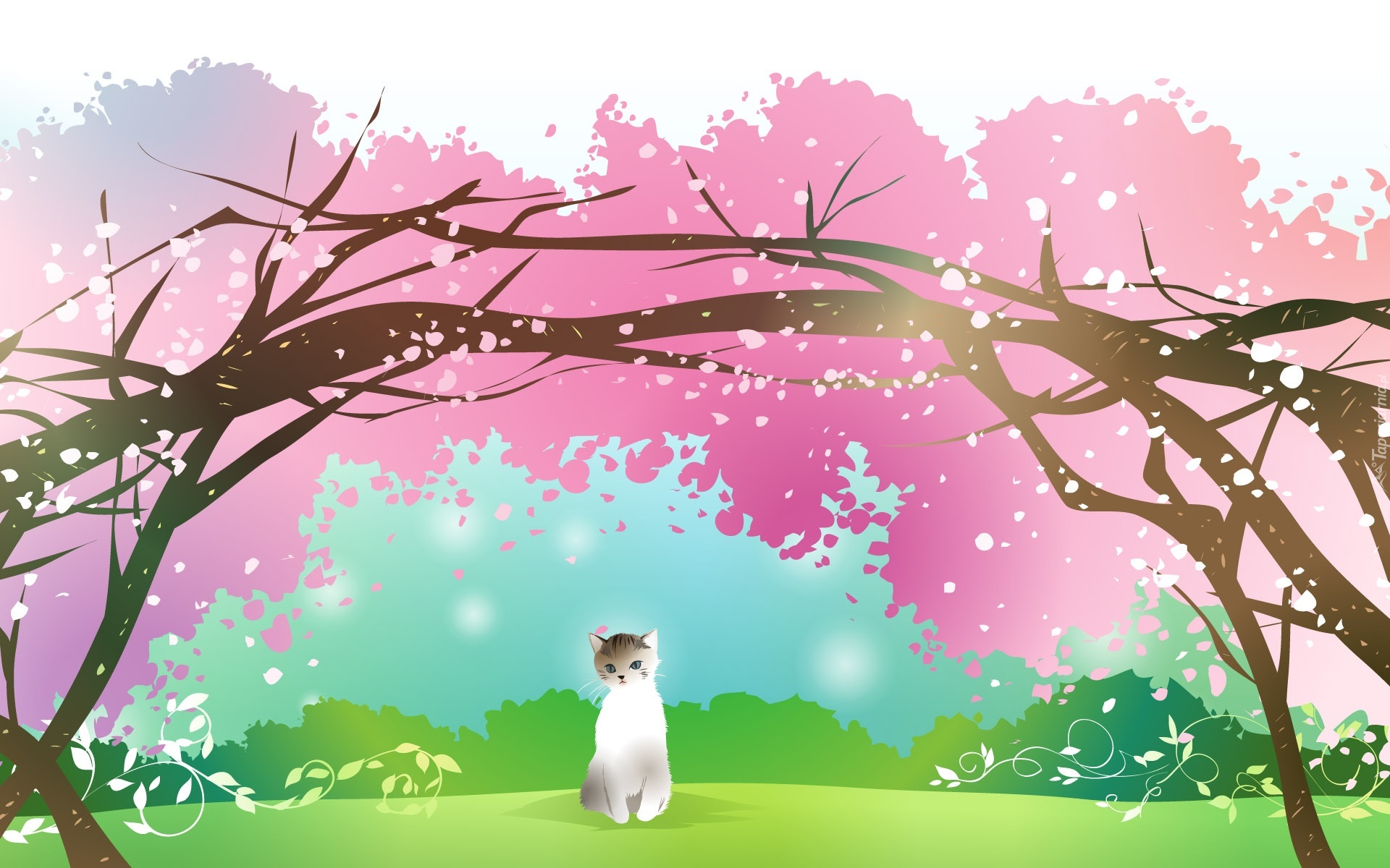 Edytor tapety: Biały, Kot, Kwitnące, Drzewa