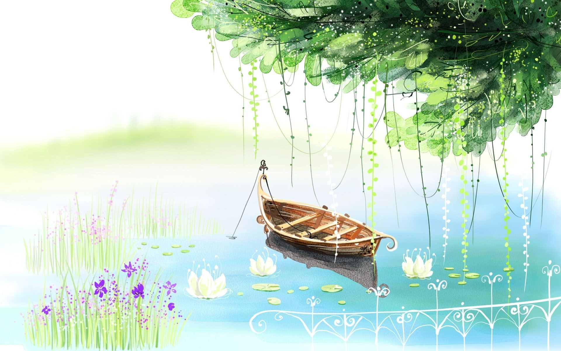 Edytor tapety: Jezioro, Łódka, Drzewo, Kwiaty